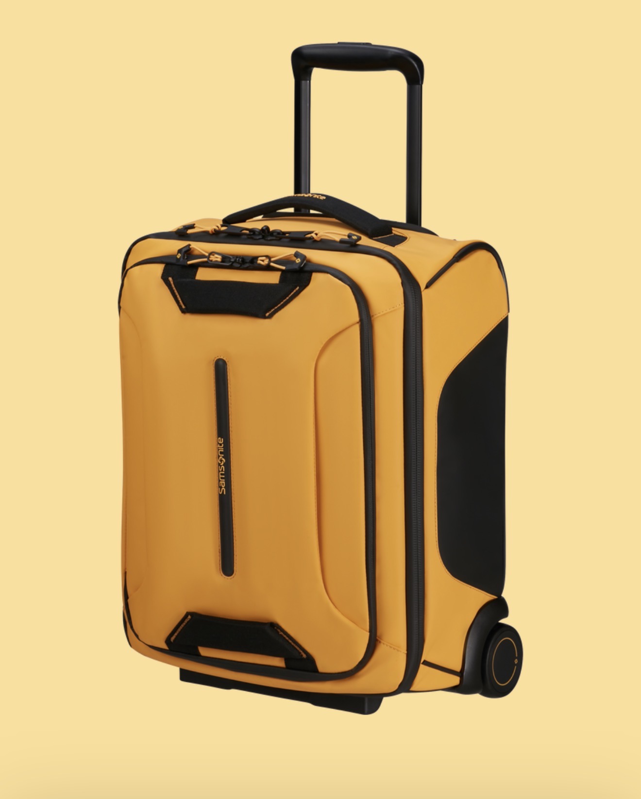 Compatibile con le misure da cabina e pensato per viaggi brevi o come bagaglio “secondario”, questo Duffle con ruote da 45 cm unisce praticità, sostenibilità e maneggevolezza. Il tessuto esterno, realizzato con materiali riciclati e trattato per resistere all’acqua, offre protezione anche in condizioni climatiche avverse. Il vano interno, ampio e funzionale, consente di organizzare abiti e accessori in modo ordinato, mentre la maneggevolezza delle ruote e la maniglia telescopica rendono facile spostarsi, anche in spazi ridotti come corridoi o scompartimenti aerei. Perfetto come underseater da portare sotto il sedile o come bagaglio a mano robusto e leggero.