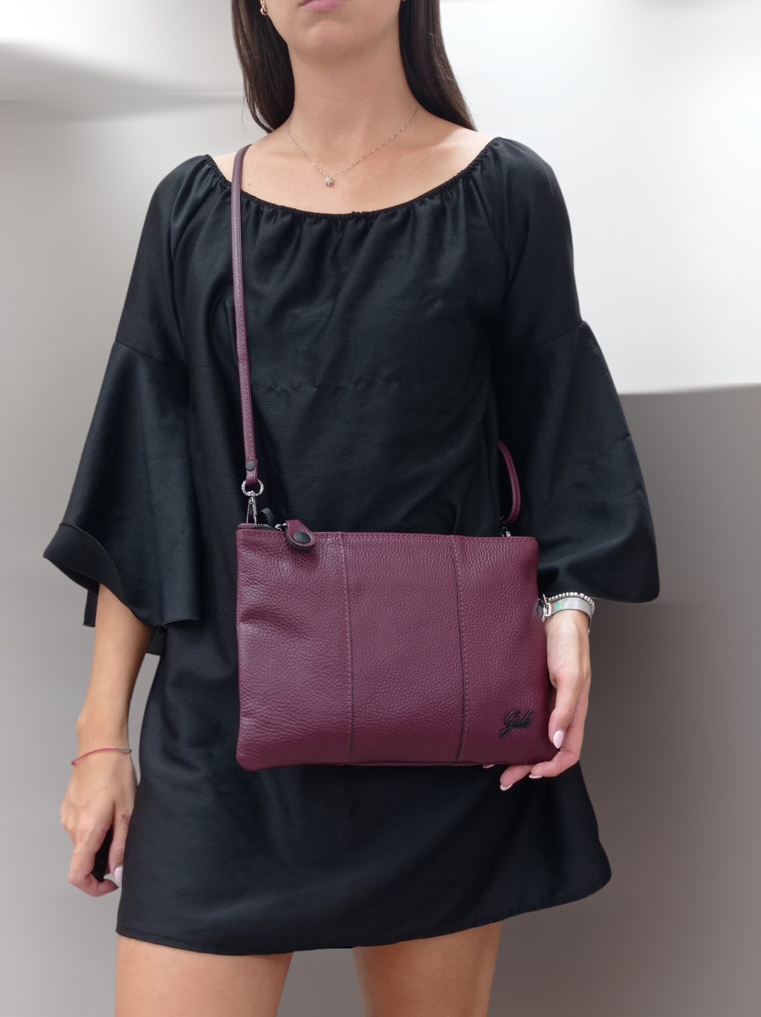 Pochette piatta realizzata in vera pelle martellata con tracolla in tono, regolabile tramite la fibbiettina. Chiusura con zip. Interni foderati con 2 taschine aperte e 1 chiusa con la zip.