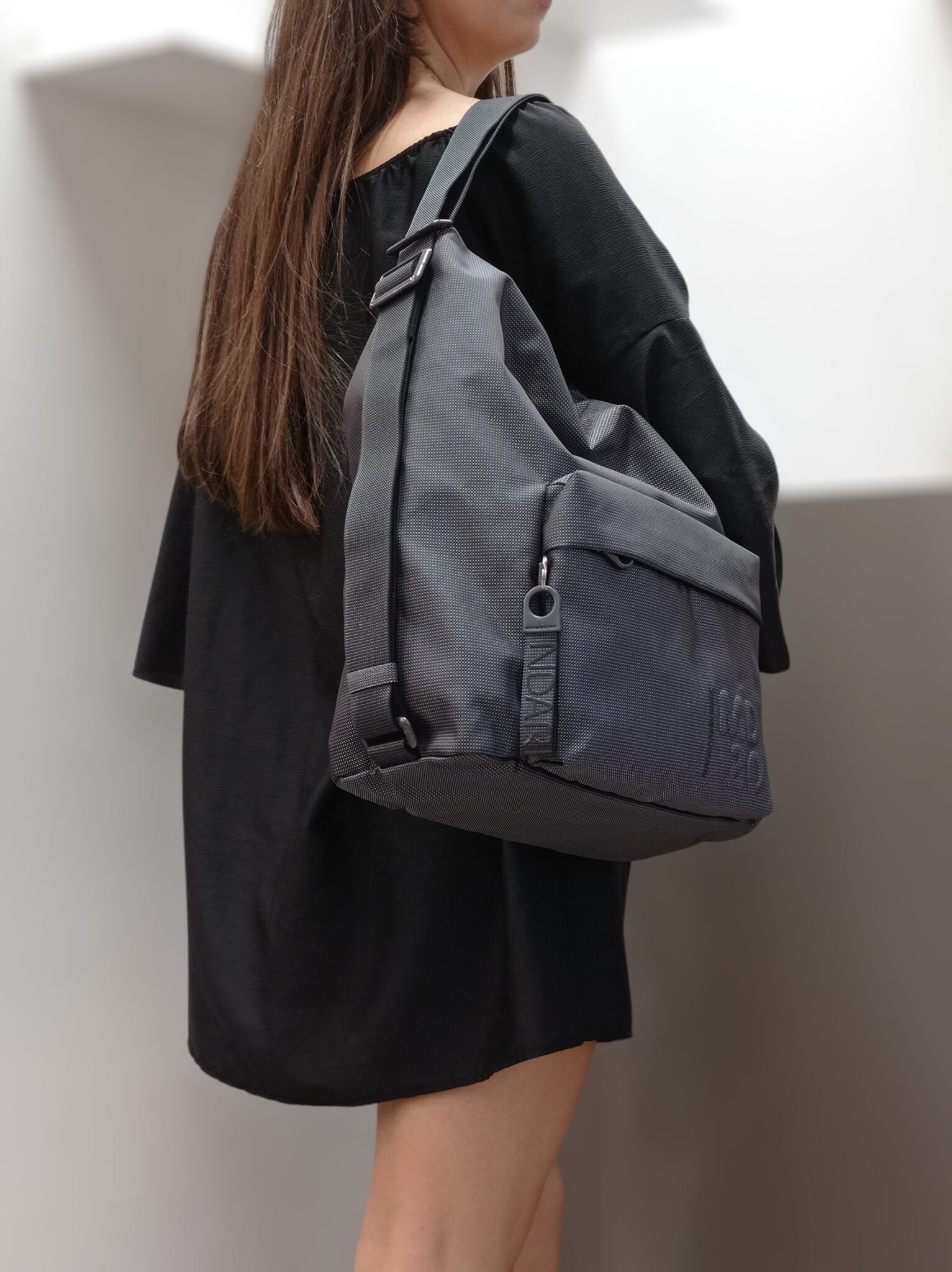 Borsa zaino realizzata in tessuto resistente. Dotata di unica tracolla per indossarla a spalla o a zaino. Chiusura principale con zip. L’interno è foderato con 1 taschina chiusa con zip e 2 aperte. Esternamente è invece dotata di una tasca frontale con zip.