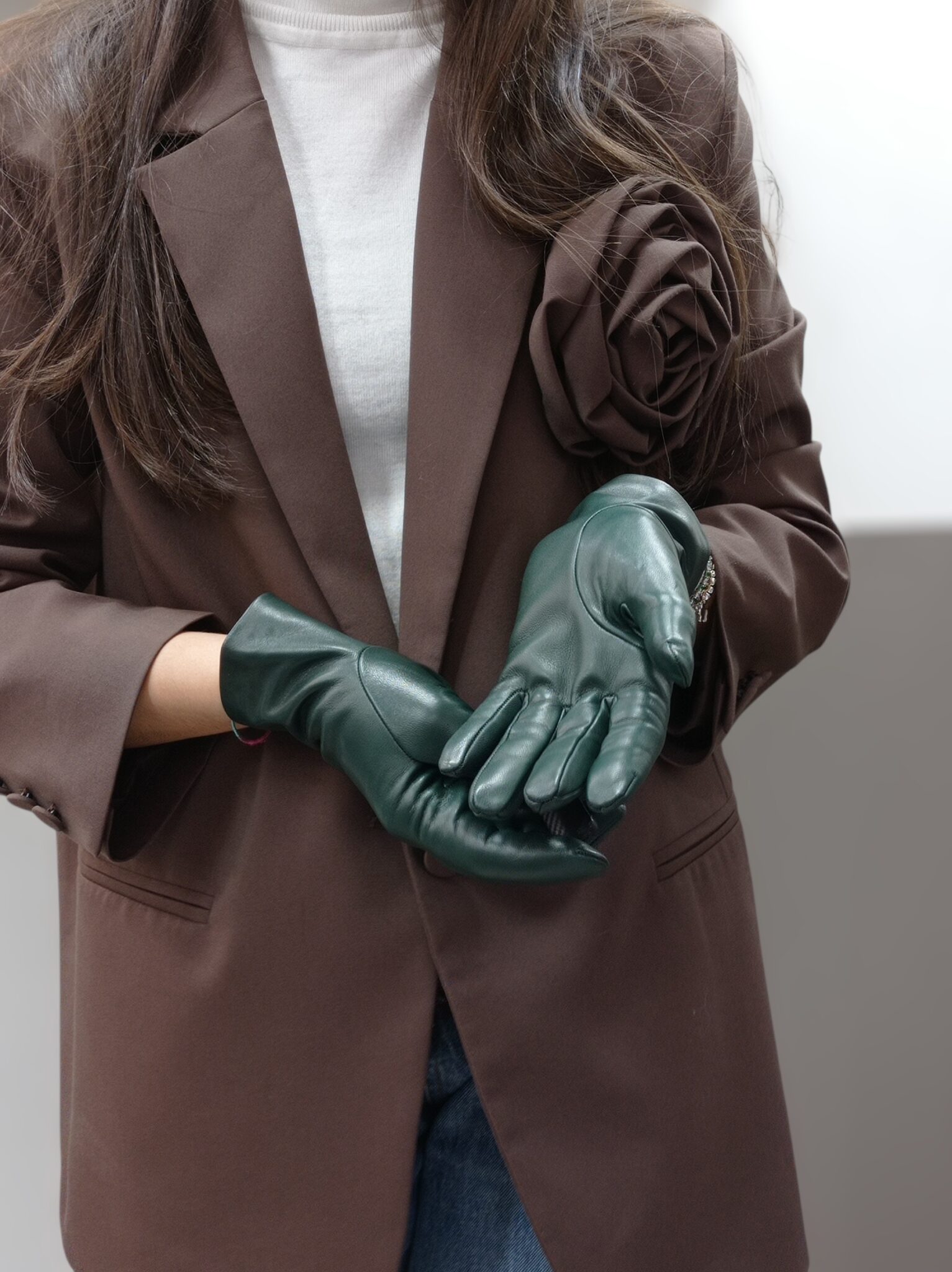 Guanto donna in vera e morbida pelle nappata. L’interno è interamente rivestito in calda lana. Il guanto è rifinito nel polso con due nappine in tono.