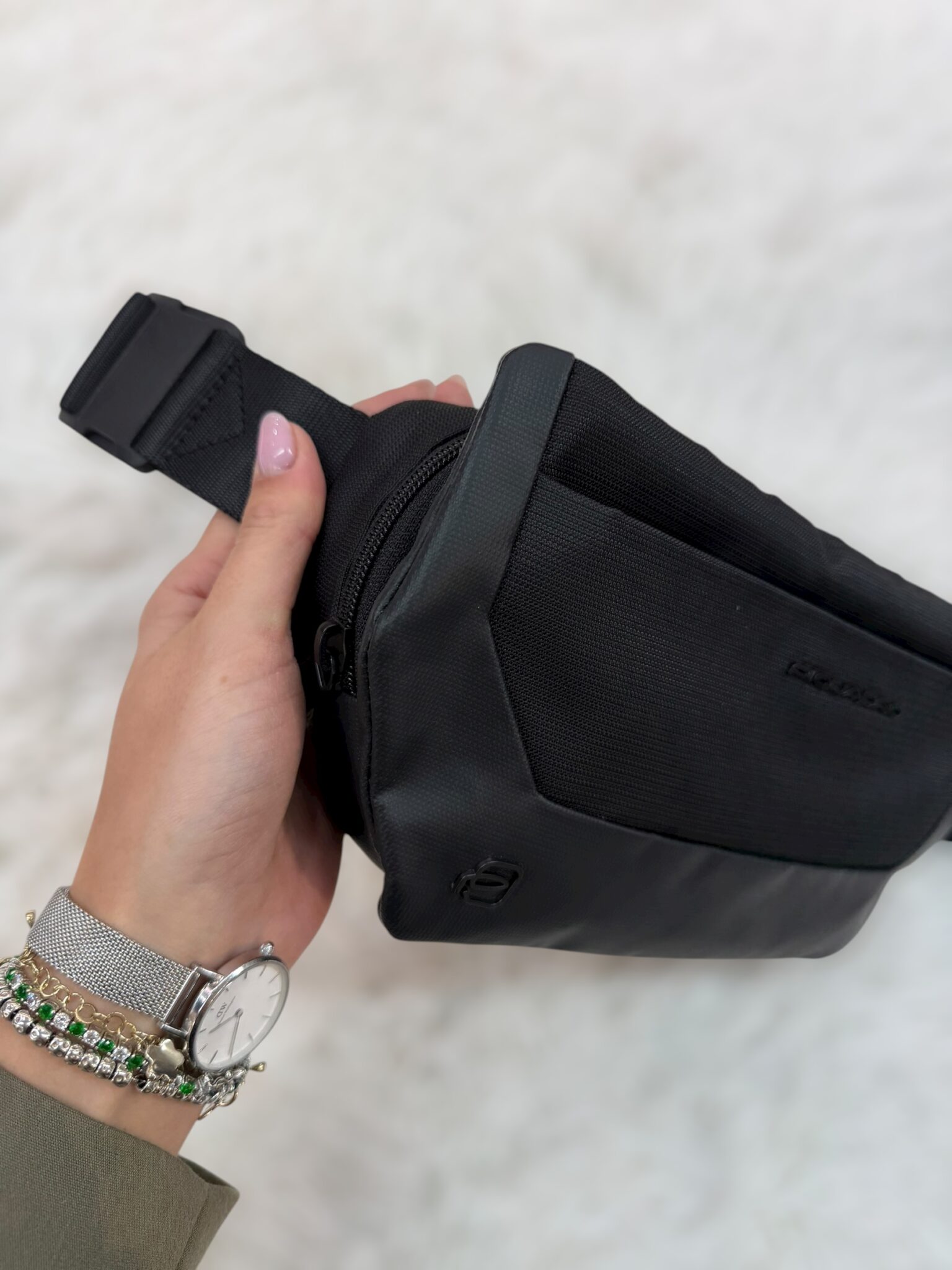 Marsupio realizzato in vera pelle nappata impermeabile con forma rettangolare. Chiusura principale con zip impermeabile. Interno foderato con taschine porta oggetti. Esternamente è dotato di due comode e ad ampie tasche, una frontale e una posteriore, entrambe con chiusura zip.