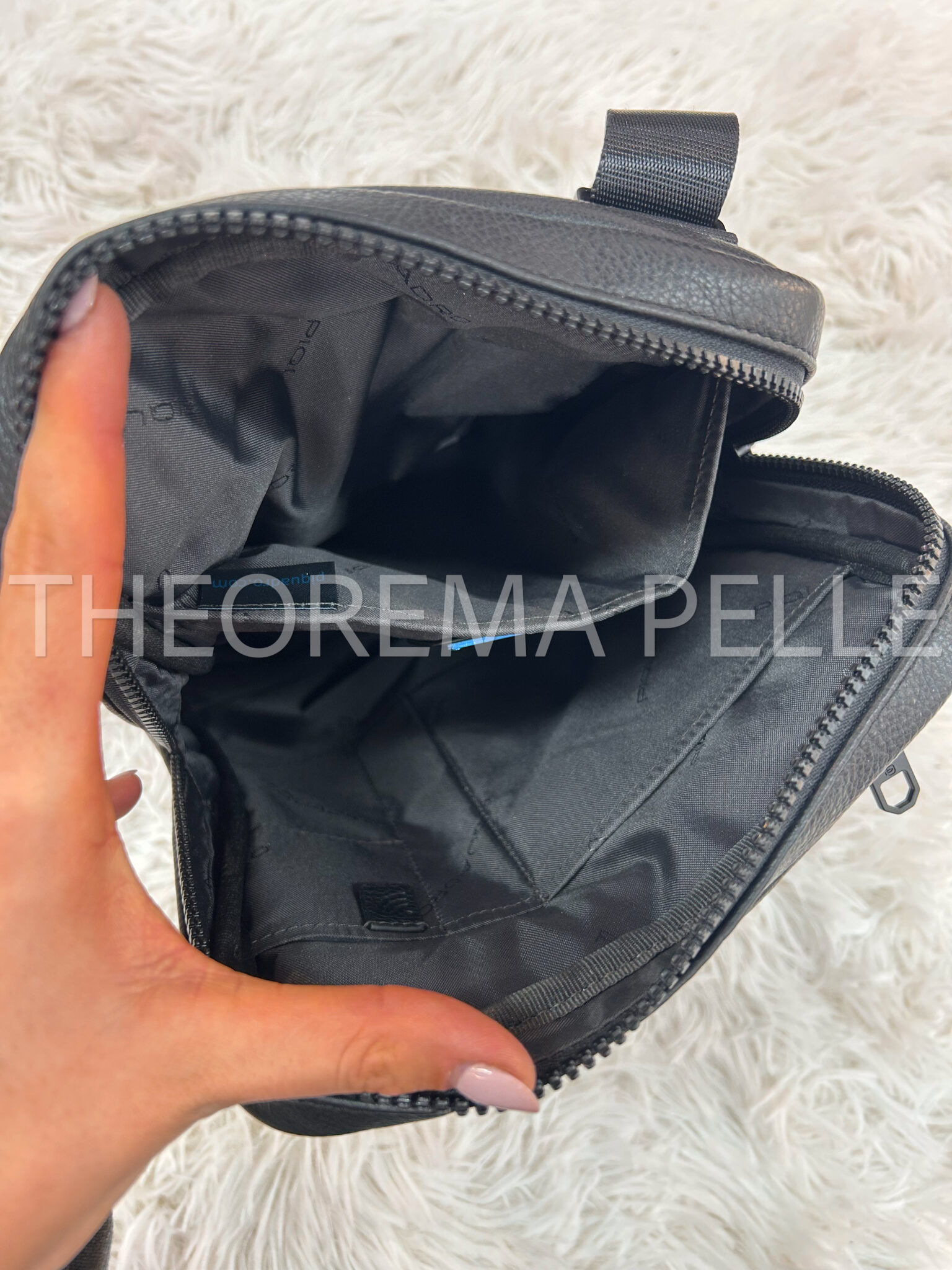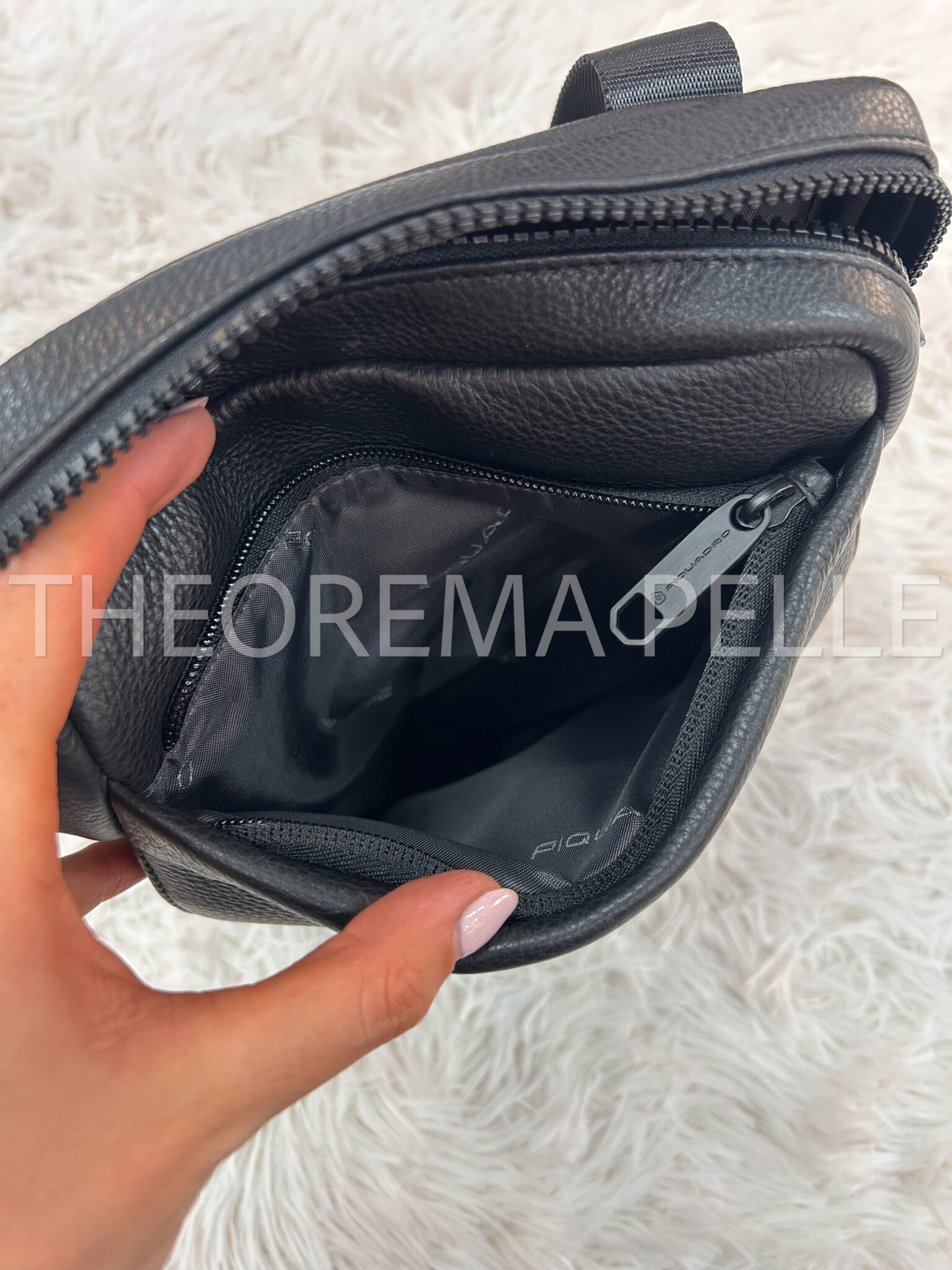 Tracolla uomo realizzata in morbida vera pelle martellata. Chiusura principale con zip, interno foderato con molteplici inserti interni porta oggetti. Esternamente è invece dotata di una tasca frontale con apertura a clip, di una seconda tasca frontale con zip e di una tasca nella parte posteriore con zip. La tracolla è lunga e regolabile con fibbiettina.