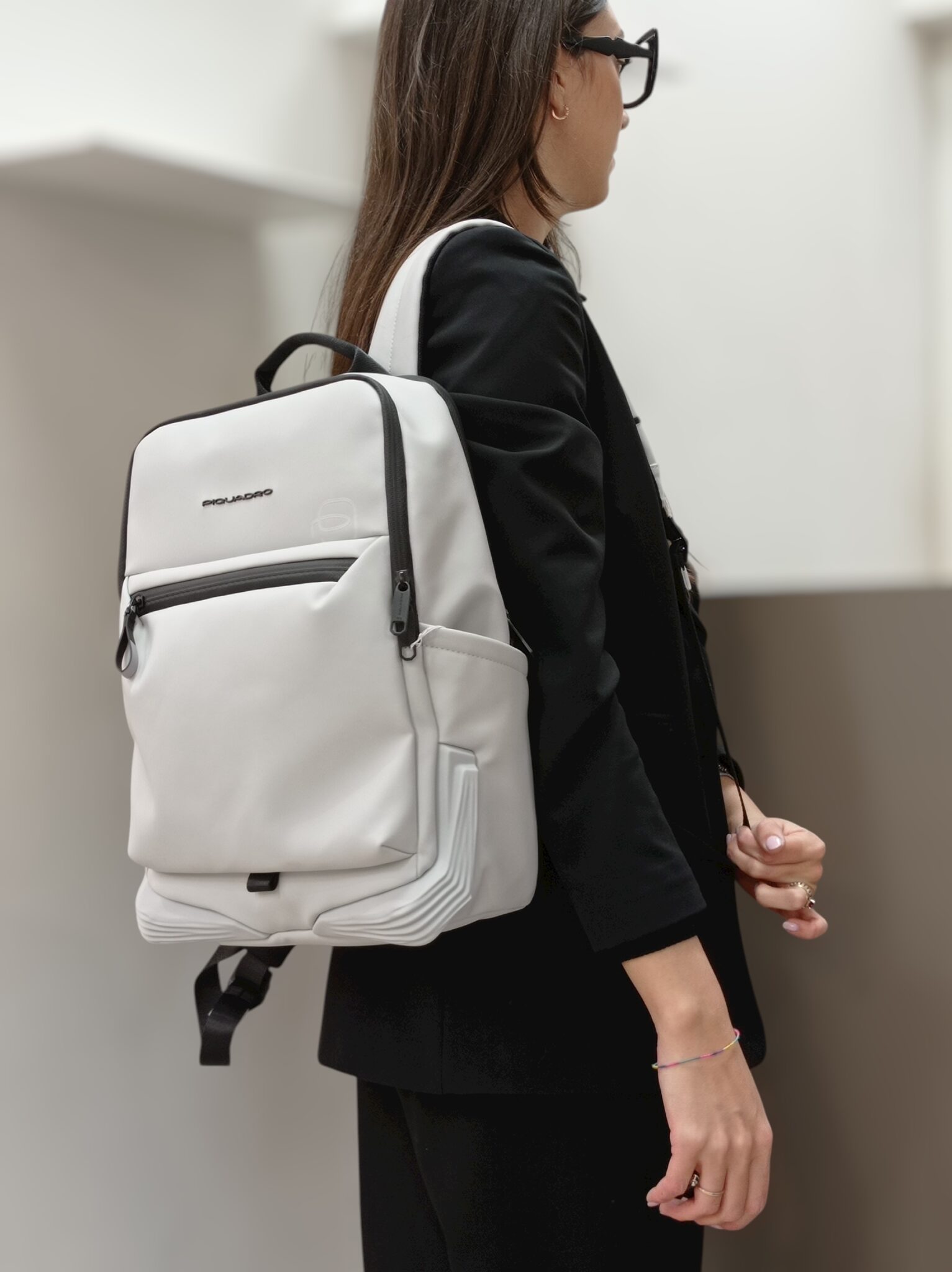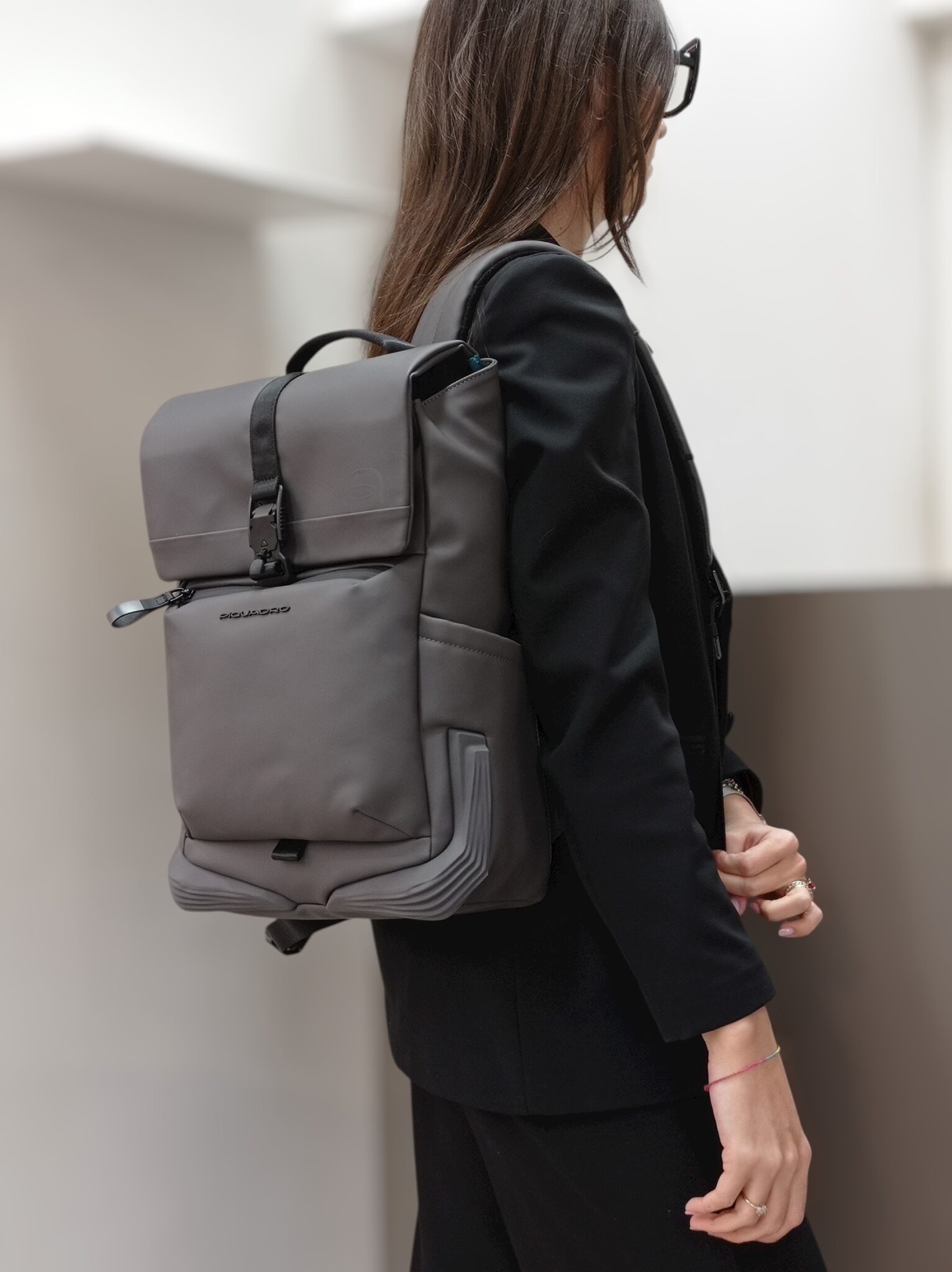 Zaino con patta realizzato interamente in gomma. Esternamente è dotato di 2 tasche laterali porta ombrello e porta bottiglia, una tasca frontale con chiusura a zip e della tasca nascosta nella parte posteriore per riporre oggetti di valore con protezione RFID (anti-clonaggio per le carte) . Apertura con magnete, interno foderato con doppio inserto imbottito per tablet e notebook 14 pollici e un’ulteriori inserti aperti porta oggetti.