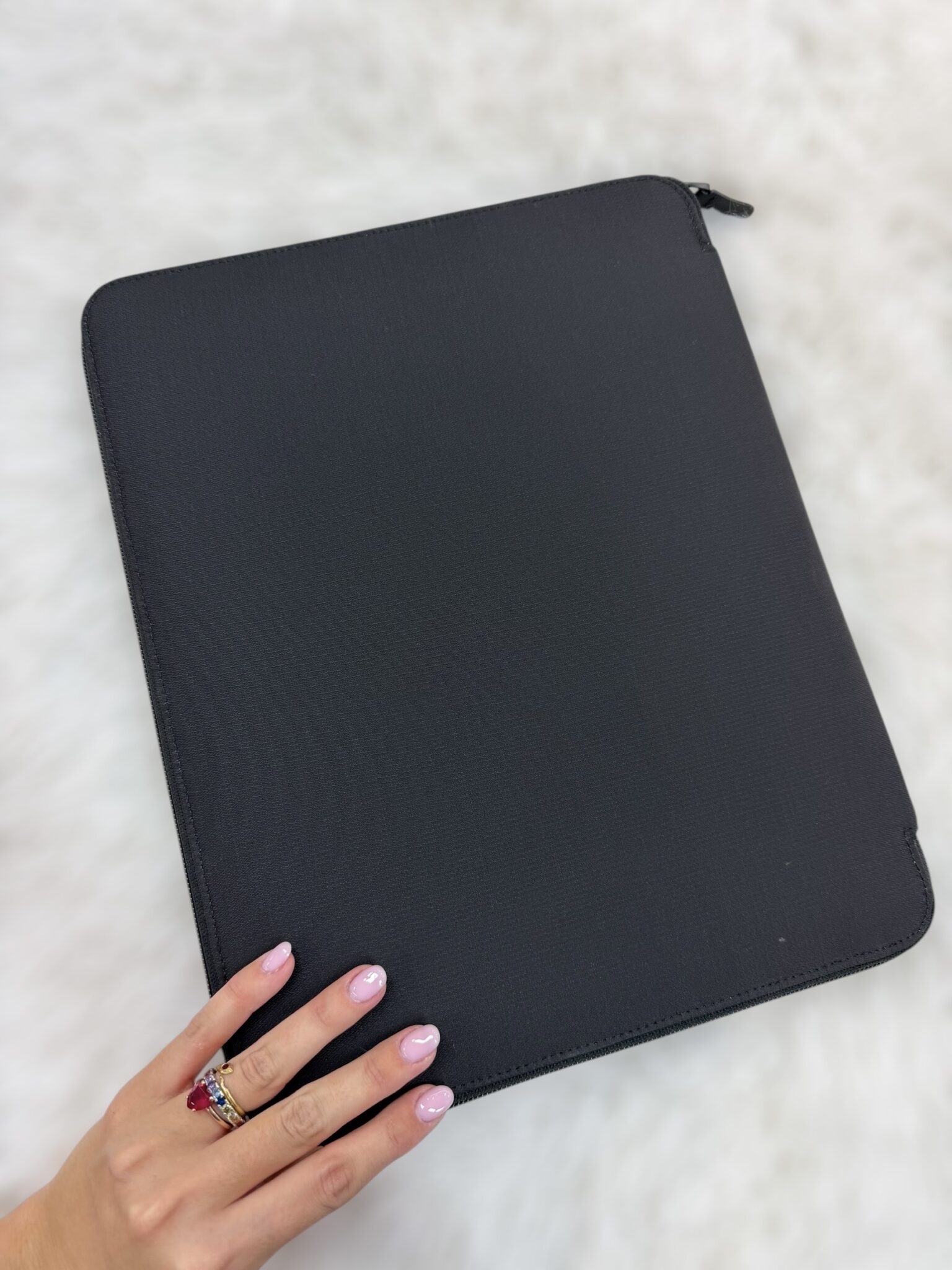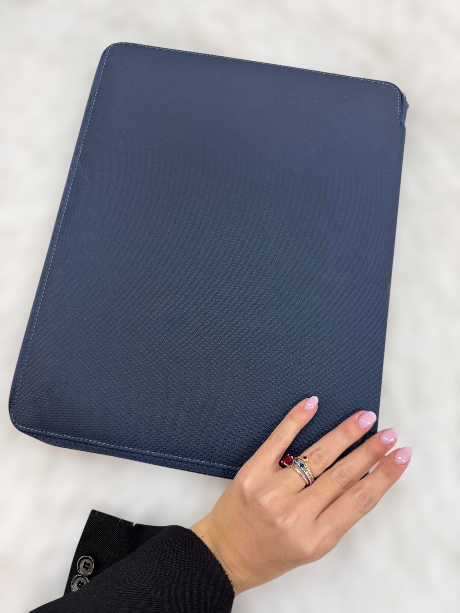 Porta blocco in tessuto con rifiniture in pelle. Chiusura con zip. Interno organizzato in due lati. Da un lato dispone di vari scomparti per carte, inserto porta penne e di un inserto per fogli A4. Dall’altro lato, lo scomparto portablocco.