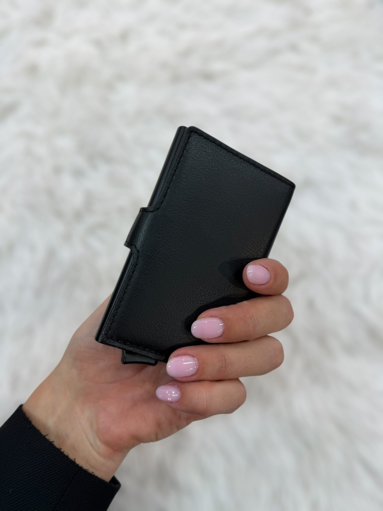 Portafoglio tascabile realizzato in vera pelle con porta carte di credito e porta banconote. Può contenere fino a 5/6 tessere nell’apposita scocca ed è dotato di scomparto per banconote e zip per le monete.