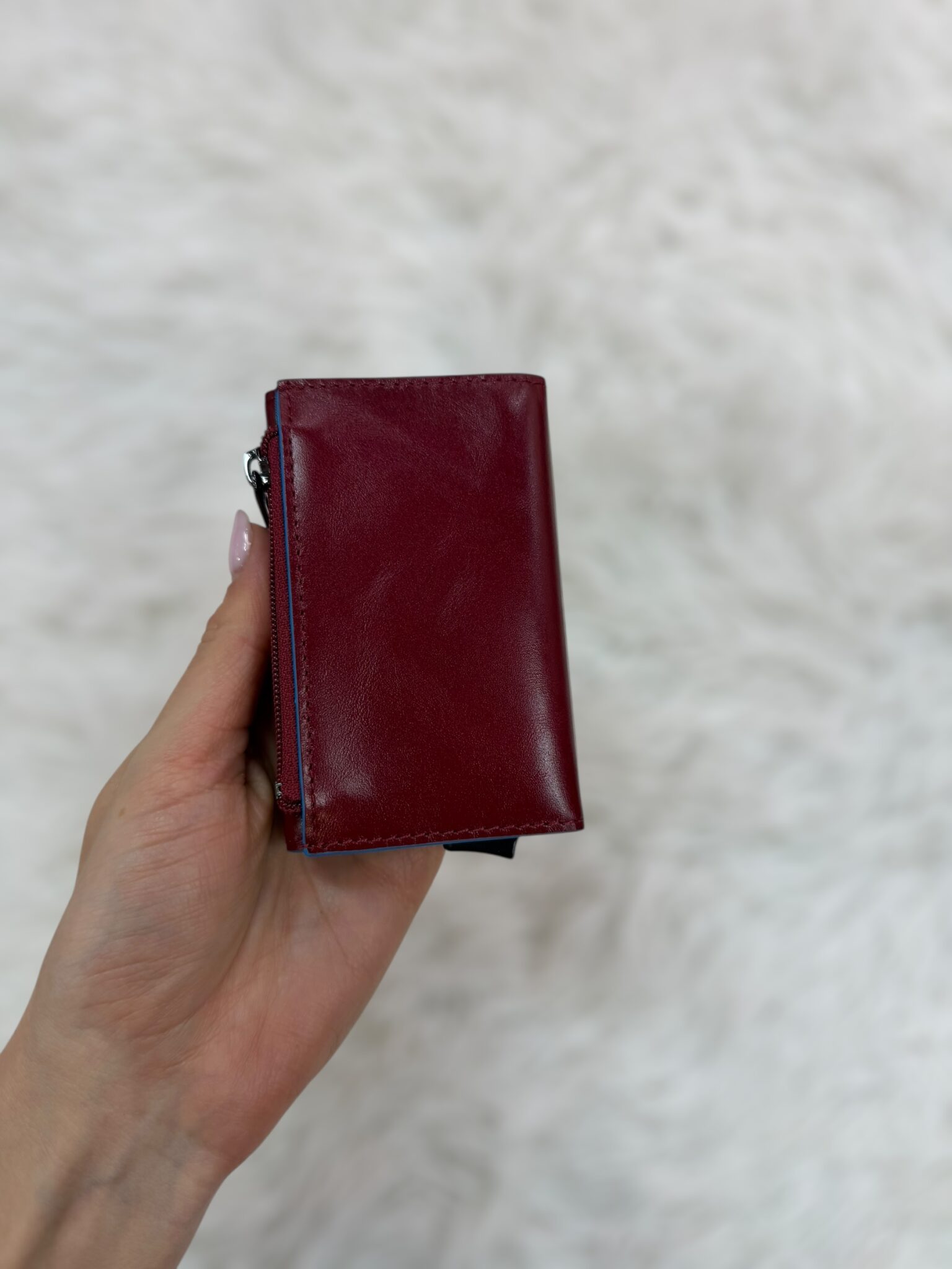 Portafoglio tascabile realizzato in vera pelle con porta carte di credito e porta banconote. Può contenere fino a 5/6 tessere nell’apposita scocca e 2/3 nello scomparto interno.