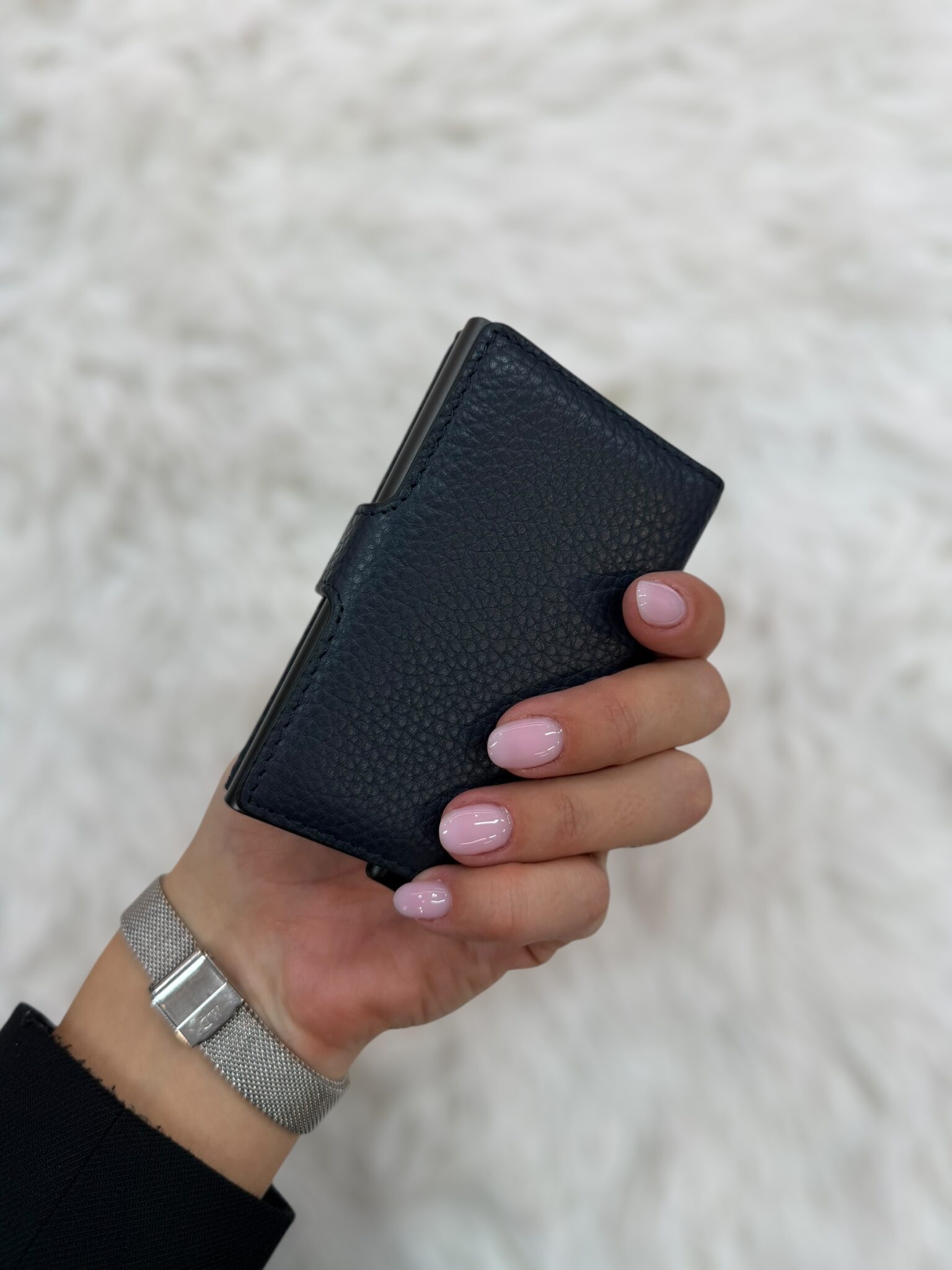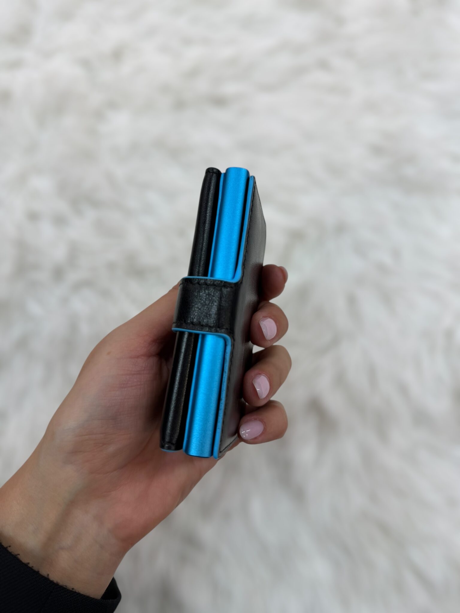 Portafoglio tascabile realizzato in vera pelle con porta carte di credito e porta banconote. Può contenere fino a 5/6 tessere nell’apposita scocca e 2/3 nello scomparto interno.