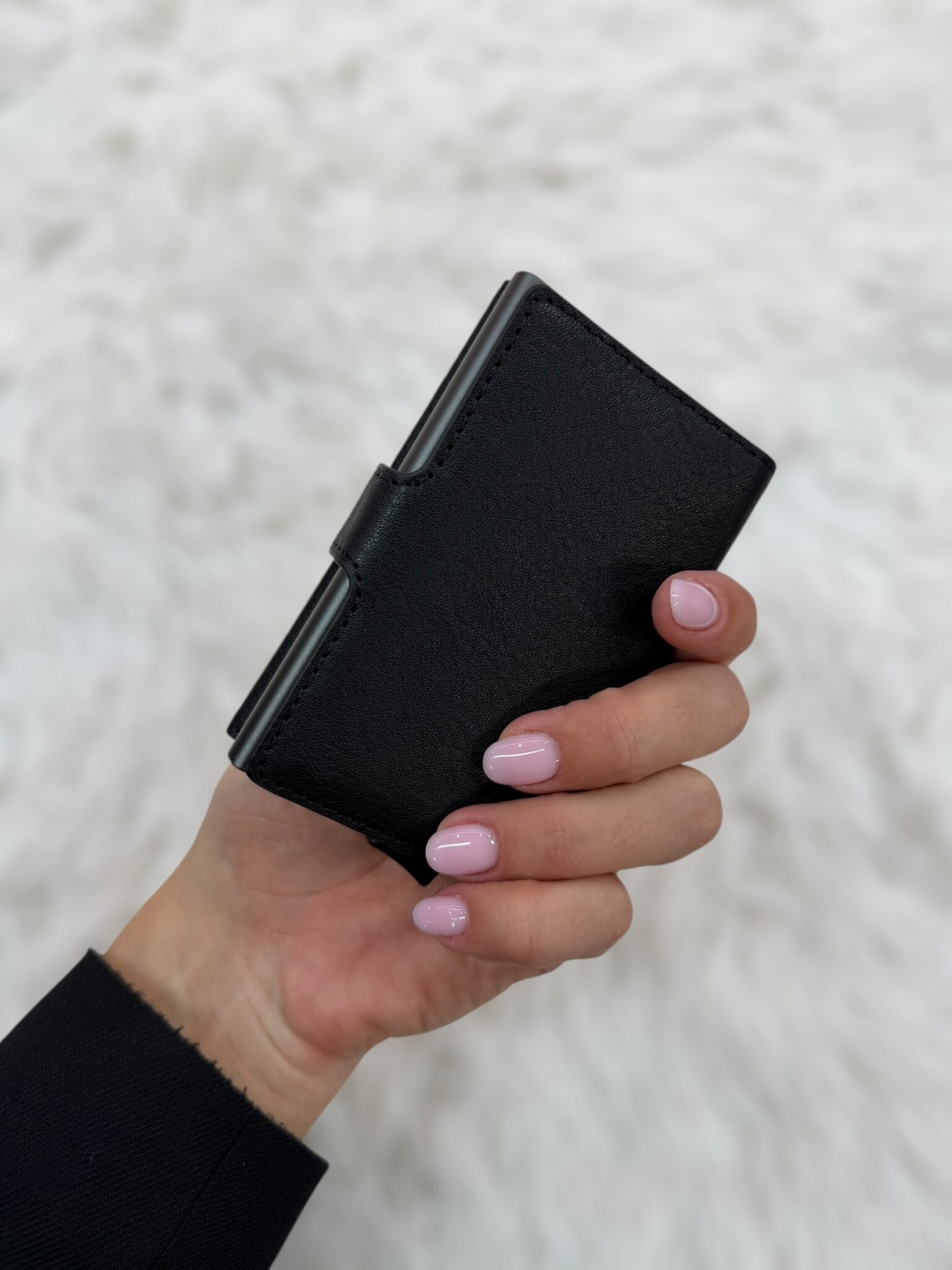 Portafoglio tascabile realizzato in vera pelle con porta carte di credito e porta banconote. Può contenere fino a 5/6 tessere nell’apposita scocca e 2/3 nello scomparto interno.