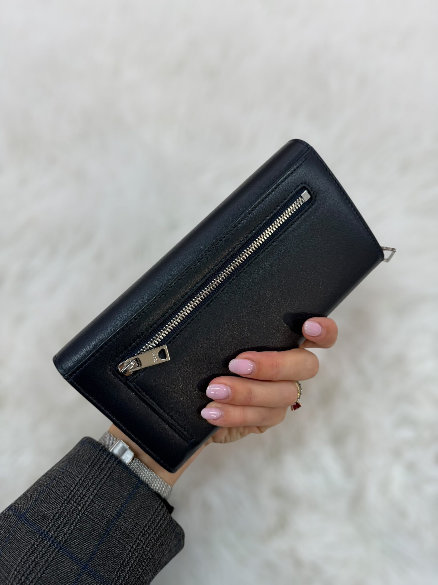 Portafoglio con bottone realizzato in vera pelle nappata colorata, dotato di 14 fessure per carte di credito, 4 per documenti, 2 per banconote e zip esterna con doppio scomparto per le monete.