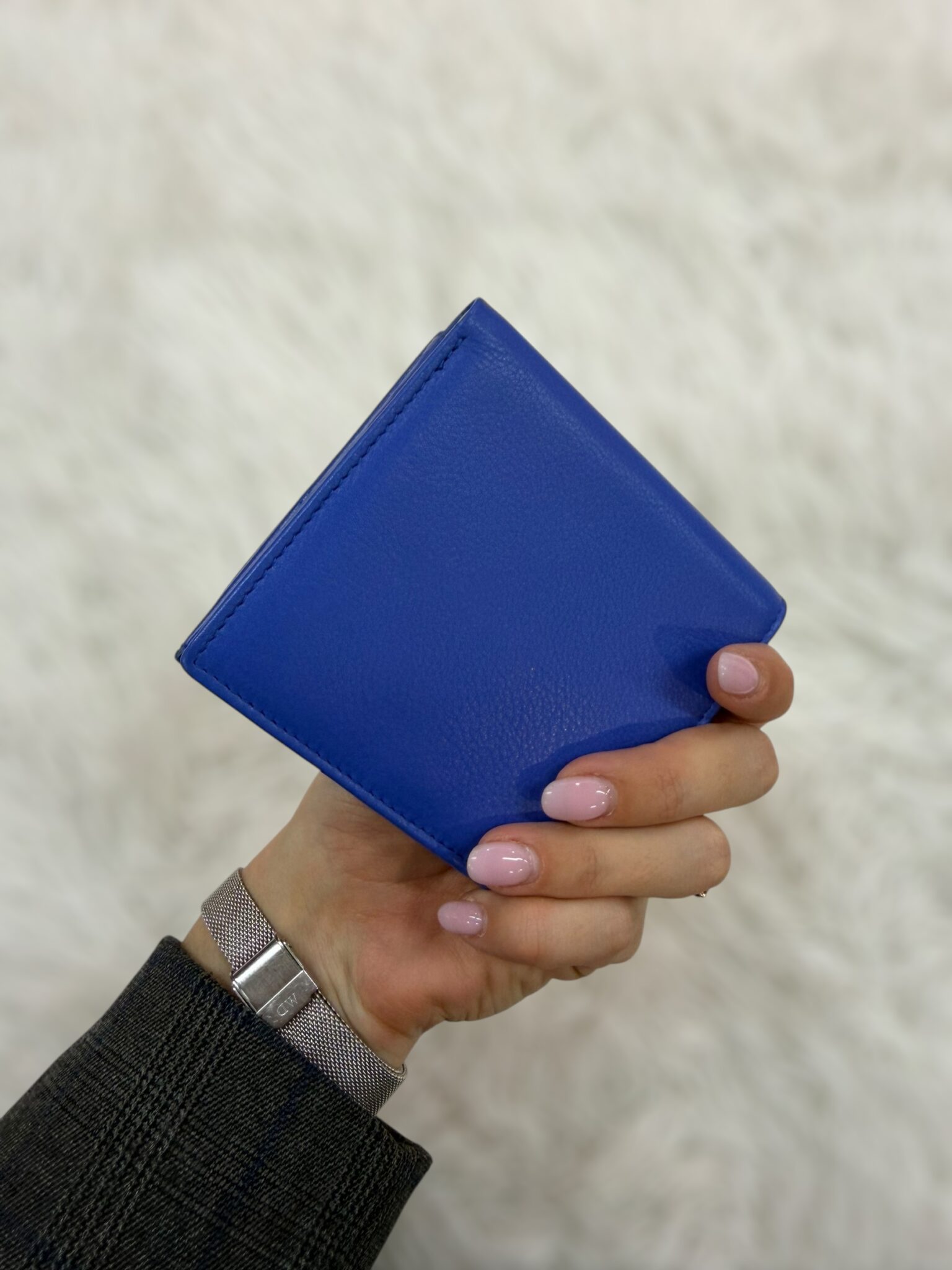 Portafoglio piccolo quadrato e compatto con bottone. Dispone di 8 scomparti per carte di credito, ulteriori 2 scomparti per documenti e dello scomparto per banconote nella parte superiore. Esternamente, è dotato di uno scomparto a scatolina per le monete.