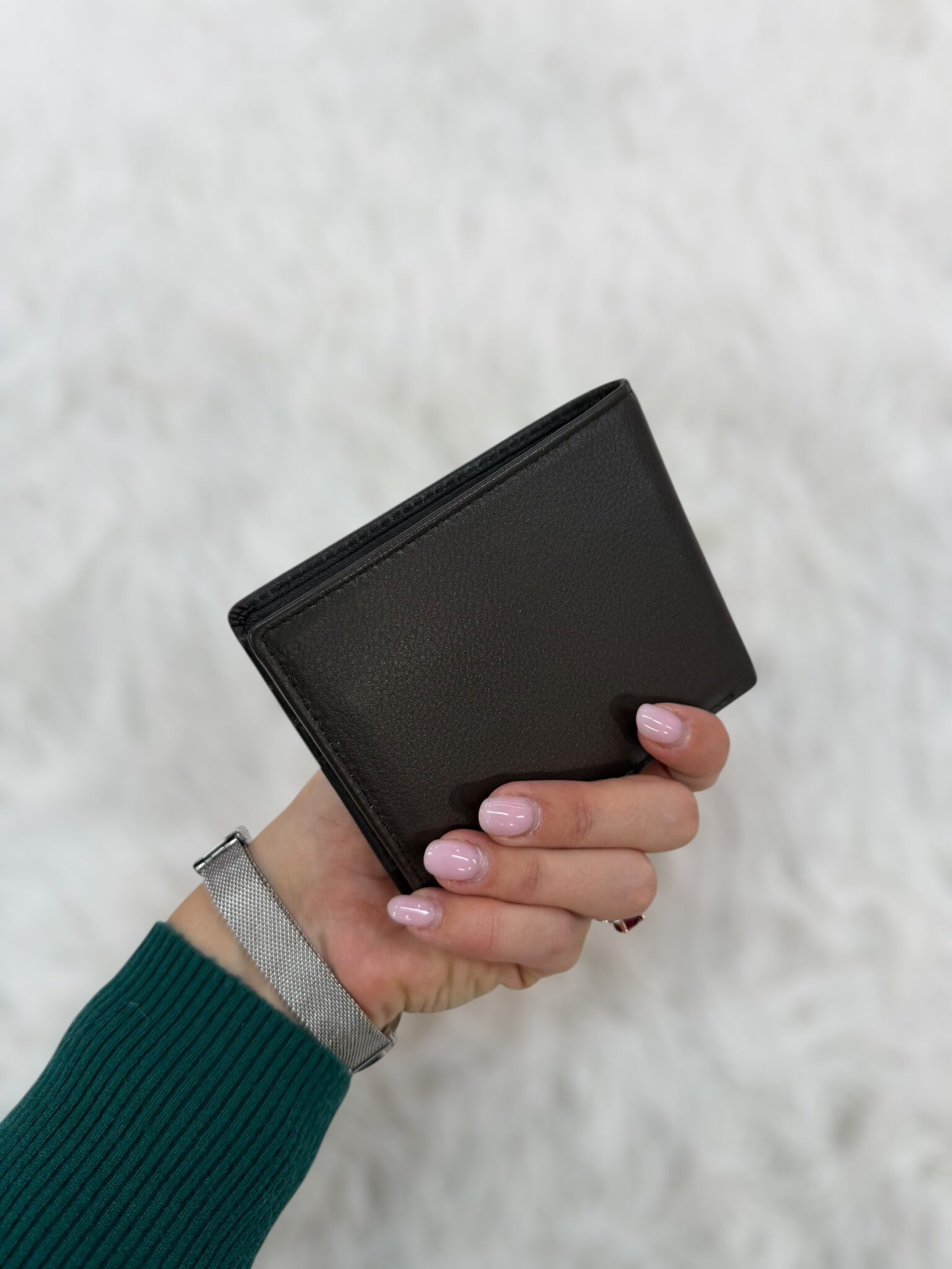 Portafoglio piccolo quadrato e compatto con bottone. Dispone di 8 scomparti per carte di credito, ulteriori 2 scomparti per documenti e dello scomparto per banconote nella parte superiore. Esternamente, è dotato di uno scomparto a scatolina per le monete.
