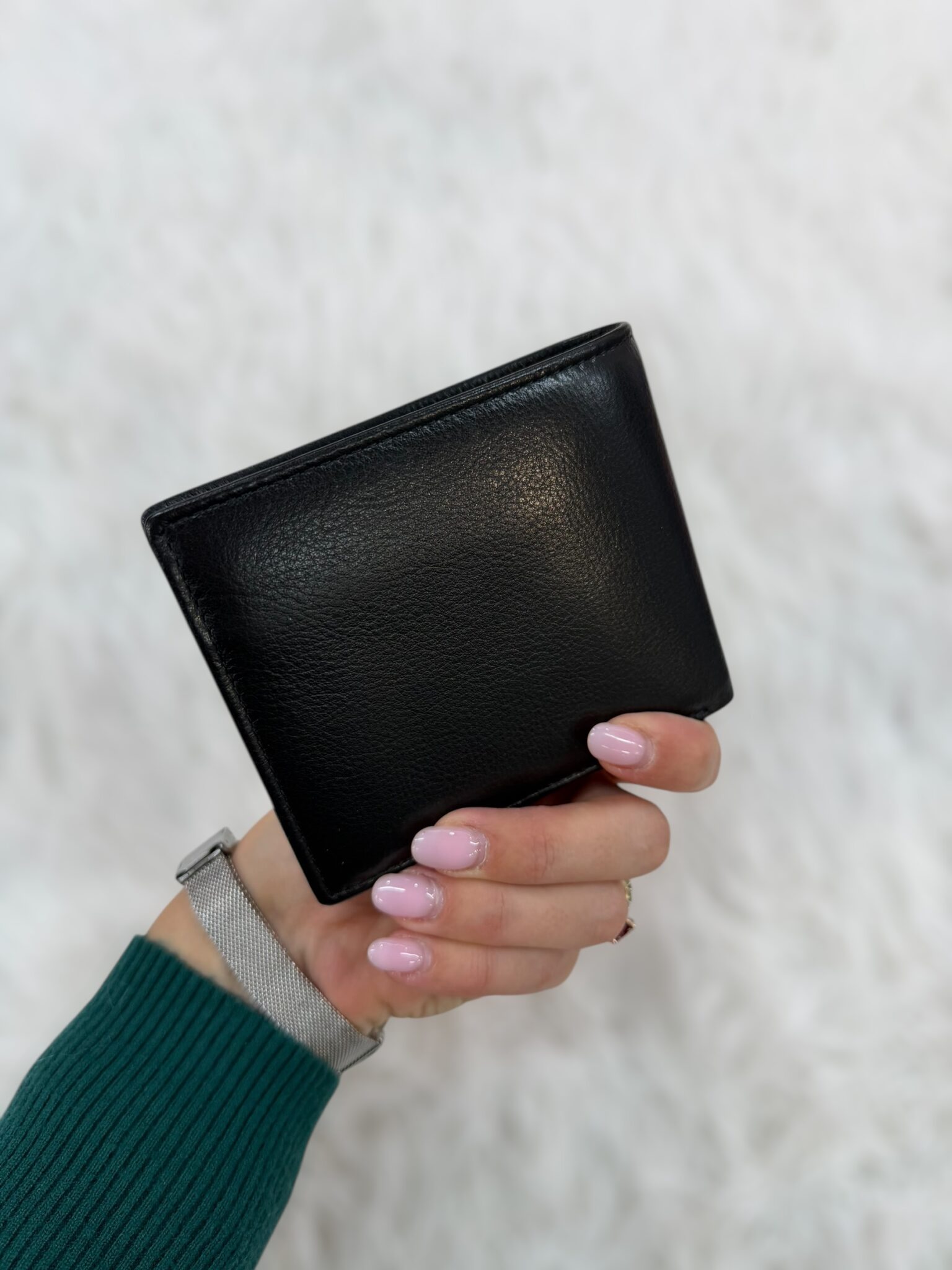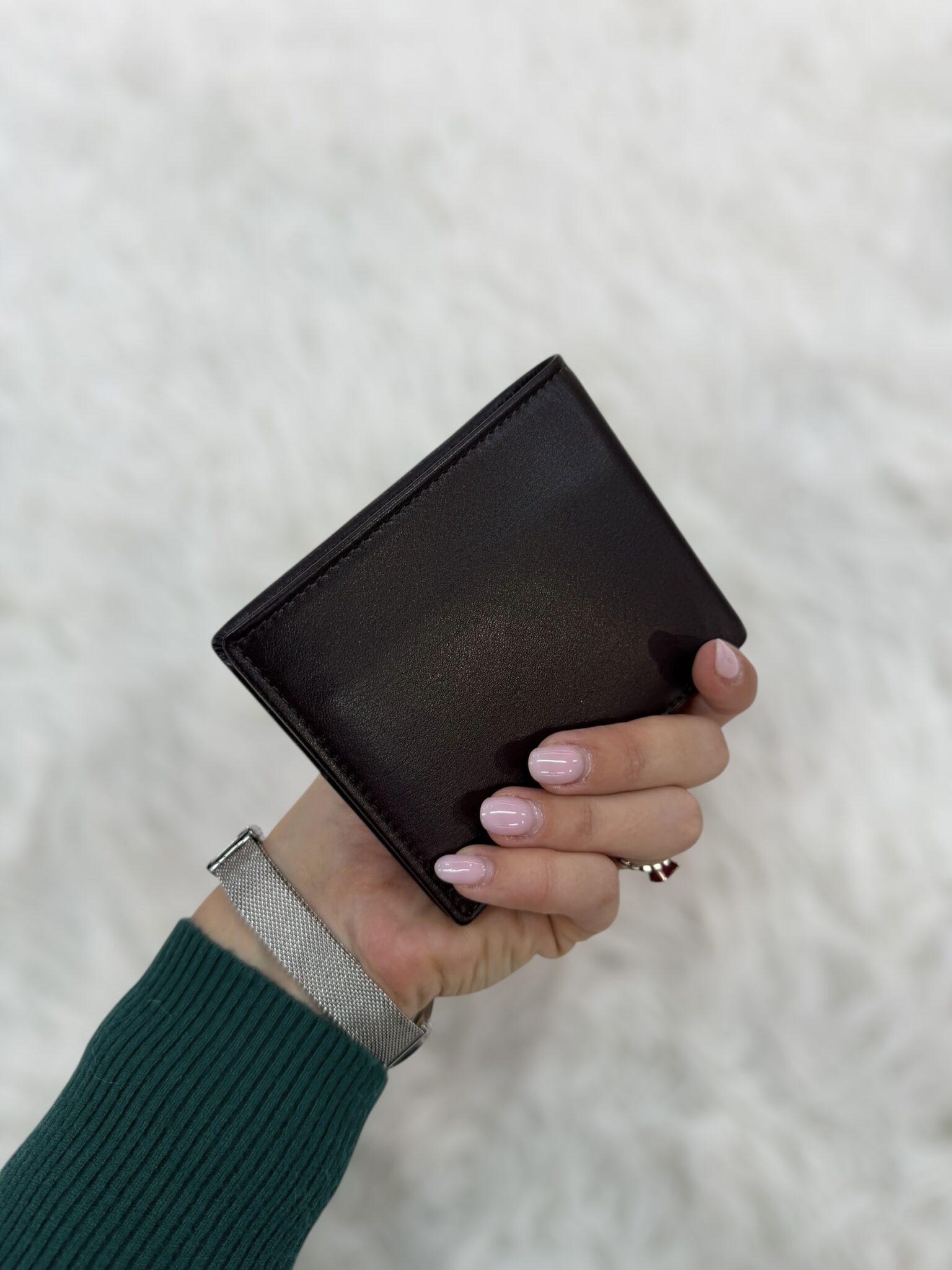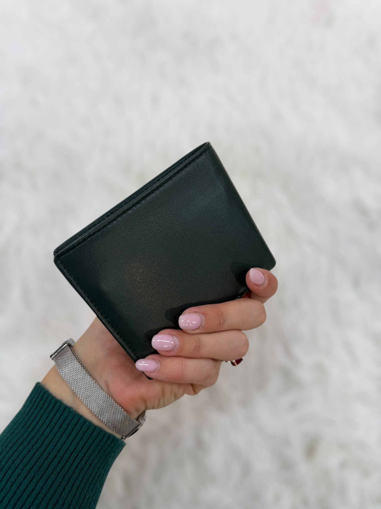 Portafoglio piccolo quadrato e compatto con bottone. Dispone di 8 scomparti per carte di credito, ulteriori 2 scomparti per documenti e dello scomparto per banconote nella parte superiore. Esternamente, è dotato di uno scomparto a scatolina per le monete.