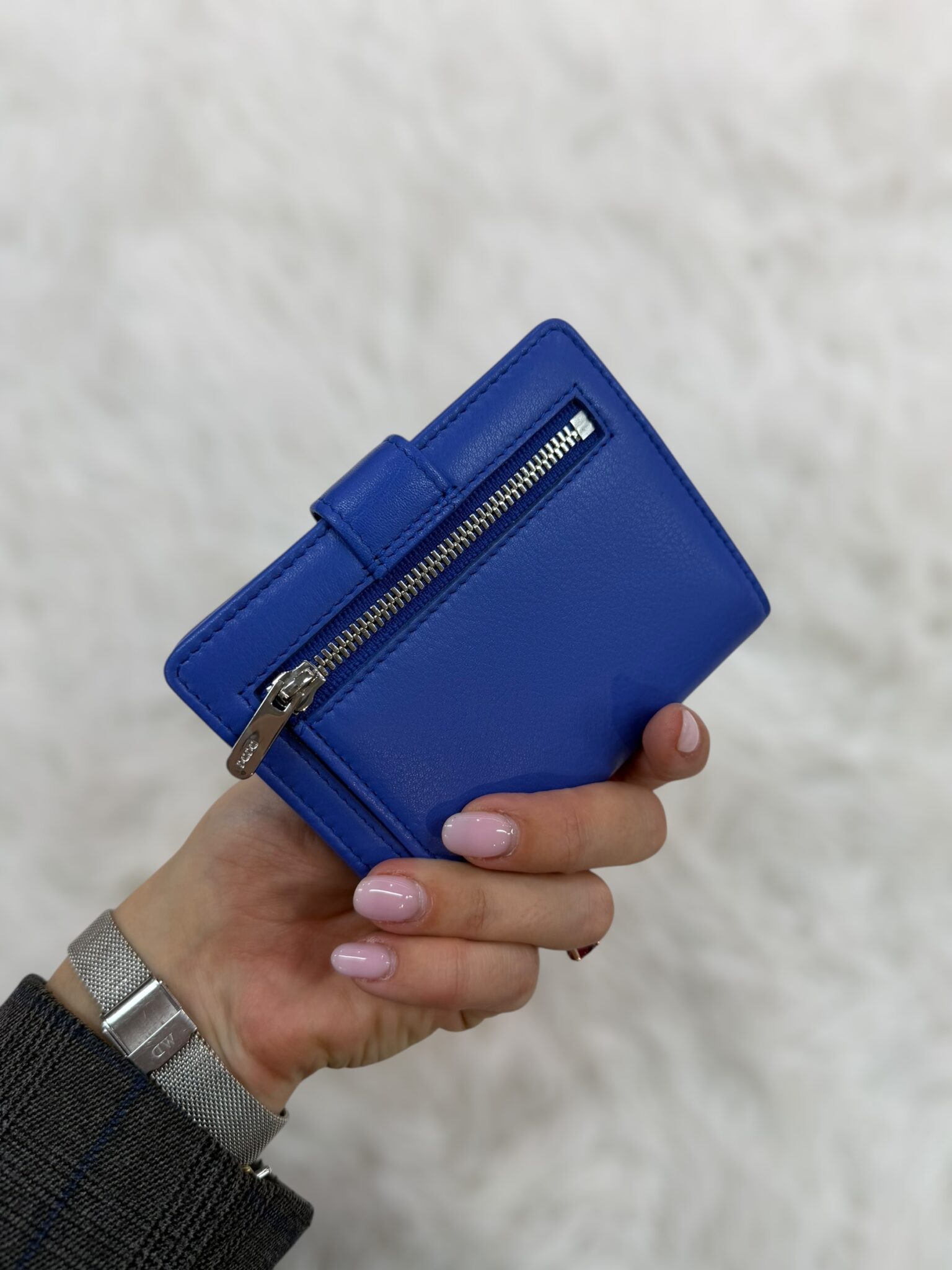Portafoglio piccolo con forma quadrata con chiusura a bottone. Dotato di 6 fessure per carte di credito, 2 scomparti per documenti e di uno scomparto per banconote. Piccola zip esterna per le monete.