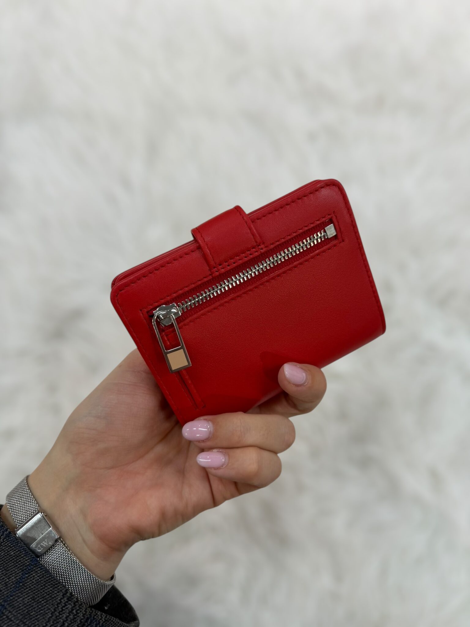 Portafoglio piccolo con forma quadrata con chiusura a bottone. Dotato di 6 fessure per carte di credito, 2 scomparti per documenti e di uno scomparto per banconote. Piccola zip esterna per le monete.