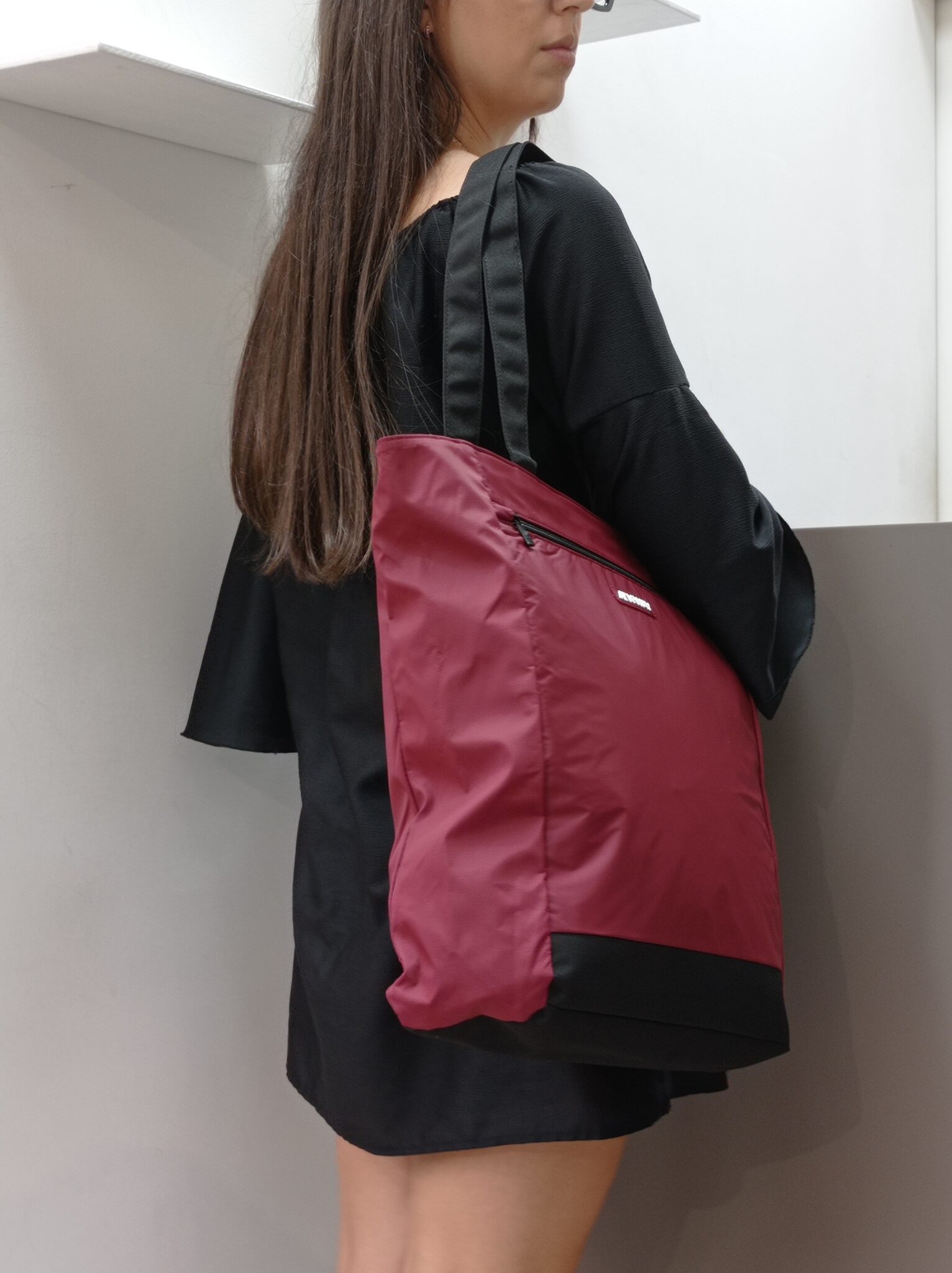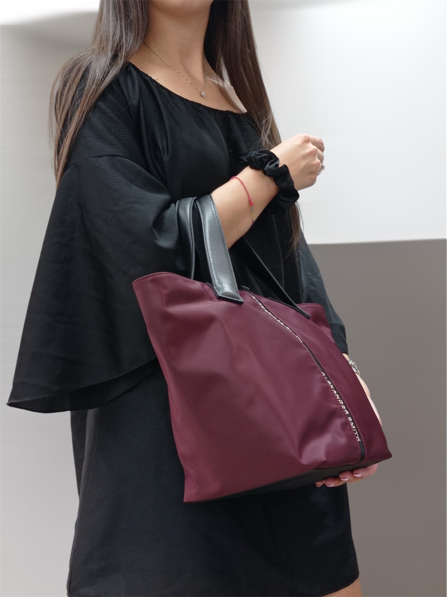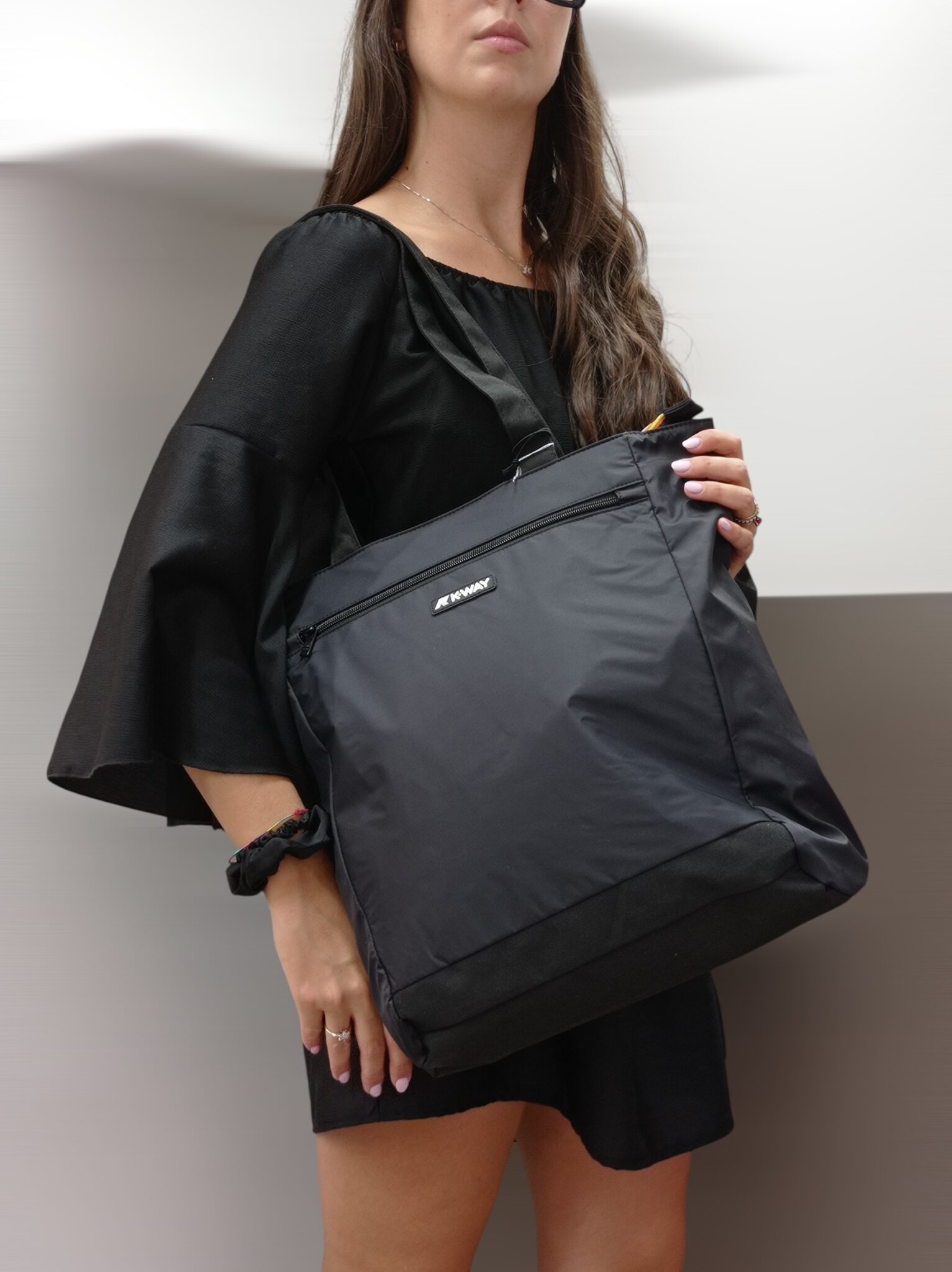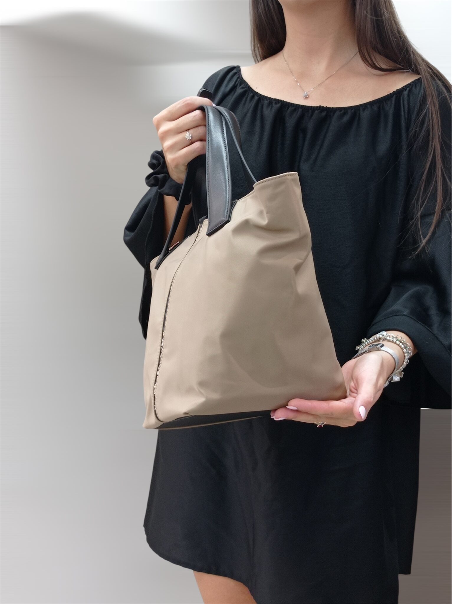 Shopper realizzata in leggero nylon impermeabile con zip a contrasto. Dotata di 2 lunghi manici per essere indossata a spalla. Interno foderato con tasca con zip porta oggetti. Dotata inoltre di una comoda tasca con la zip nella parte frontale.