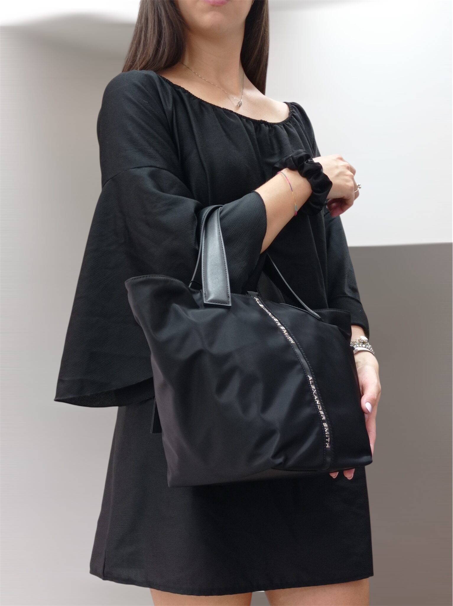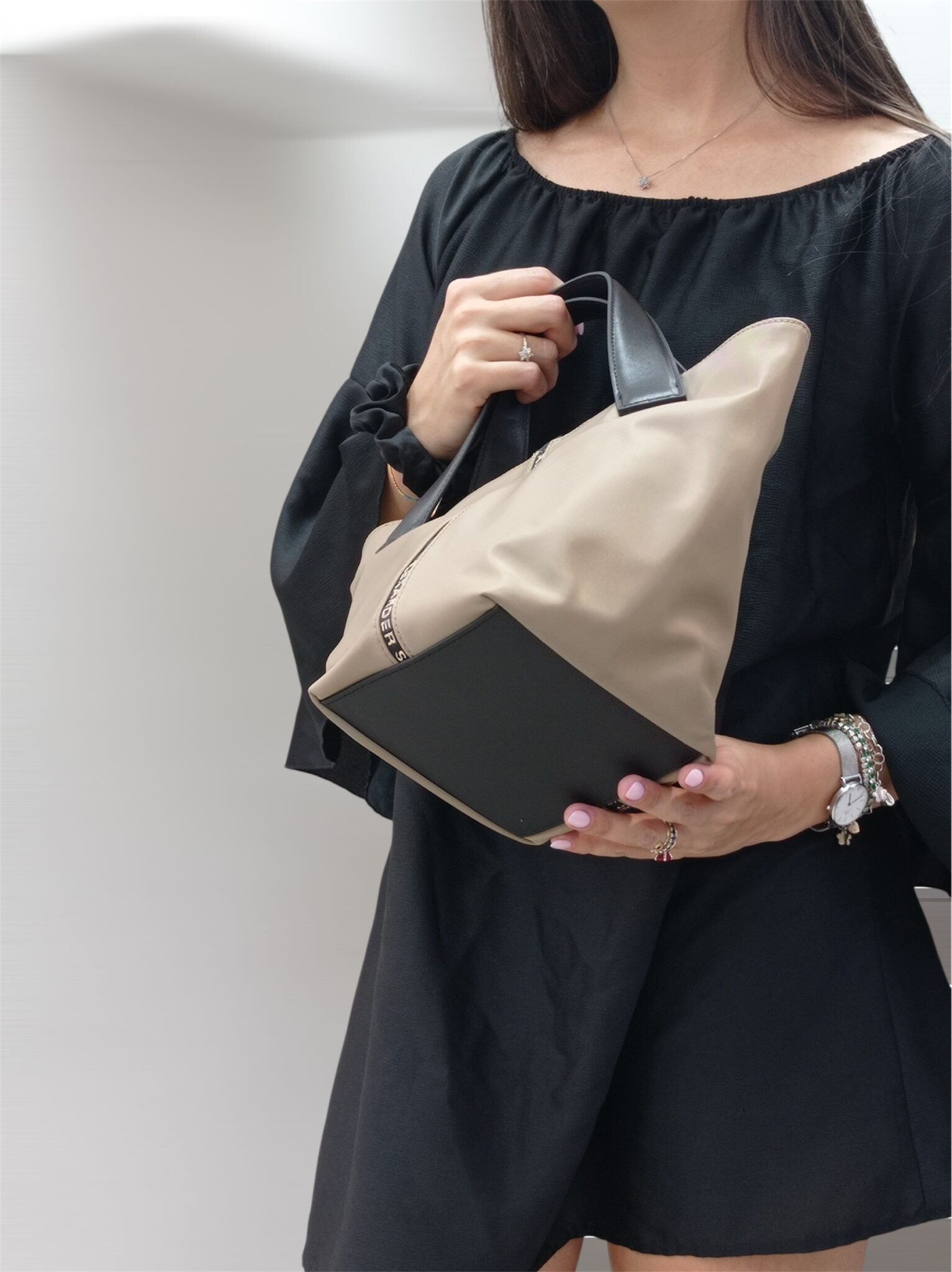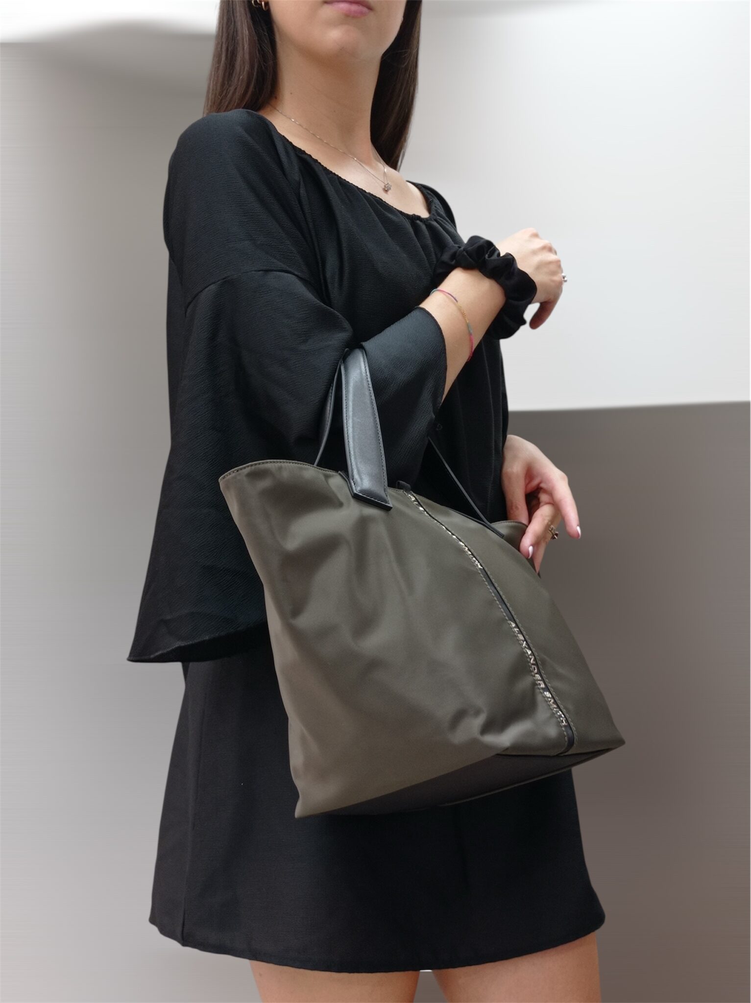 Shopper realizzata in leggero nylon impermeabile con  zip a contrasto. Dotata di 2 lunghi manici per essere indossata a spalla. Interno foderato con tasca con zip porta oggetti. Dotata inoltre di una comoda tasca con la zip nella parte frontale.