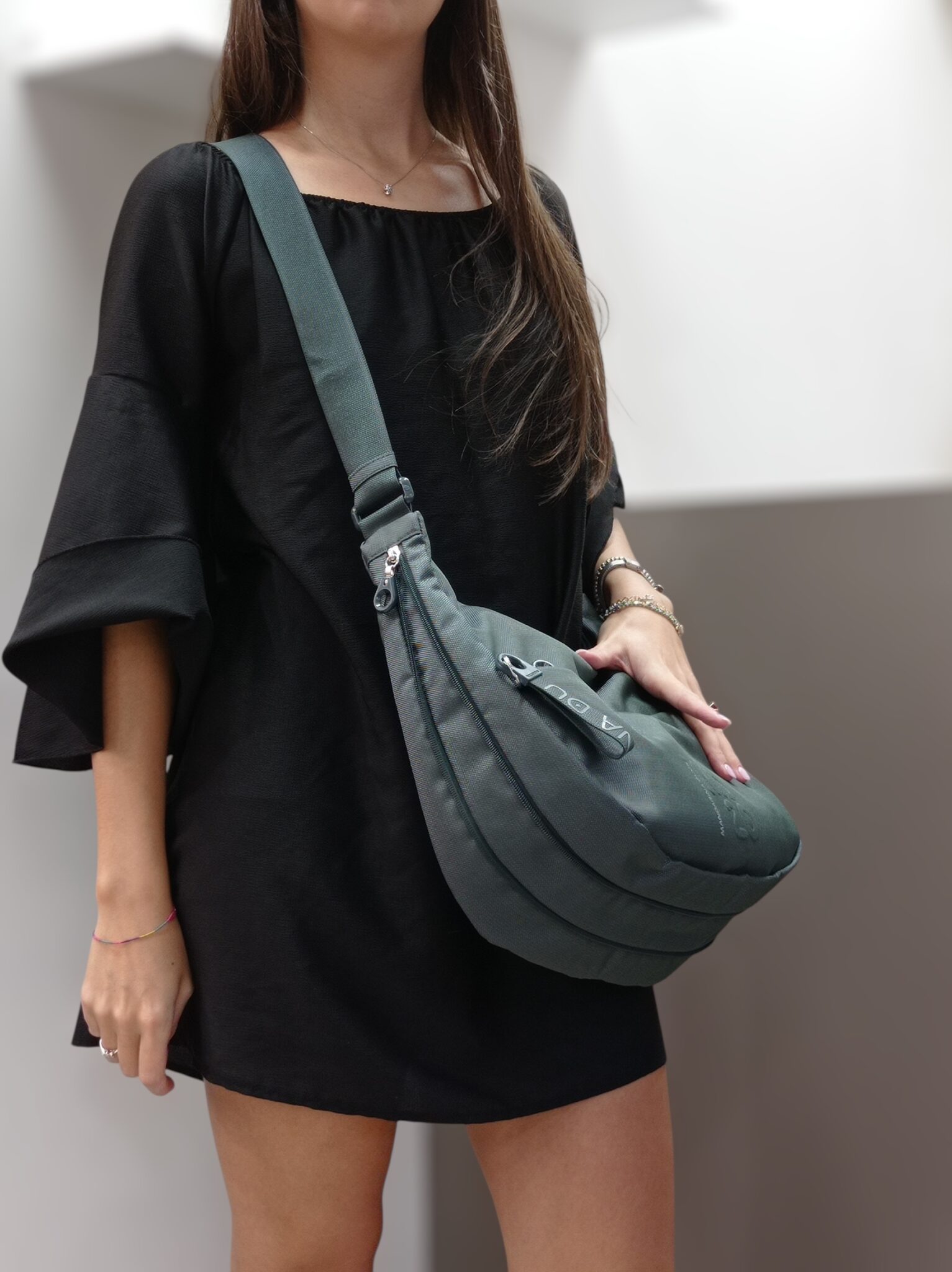 Shopper realizzata in leggero nylon impermeabile con  zip a contrasto. Dotata di 2 lunghi manici per essere indossata a spalla. Interno foderato con tasca con zip porta oggetti. Dotata inoltre di una comoda tasca con la zip nella parte frontale.