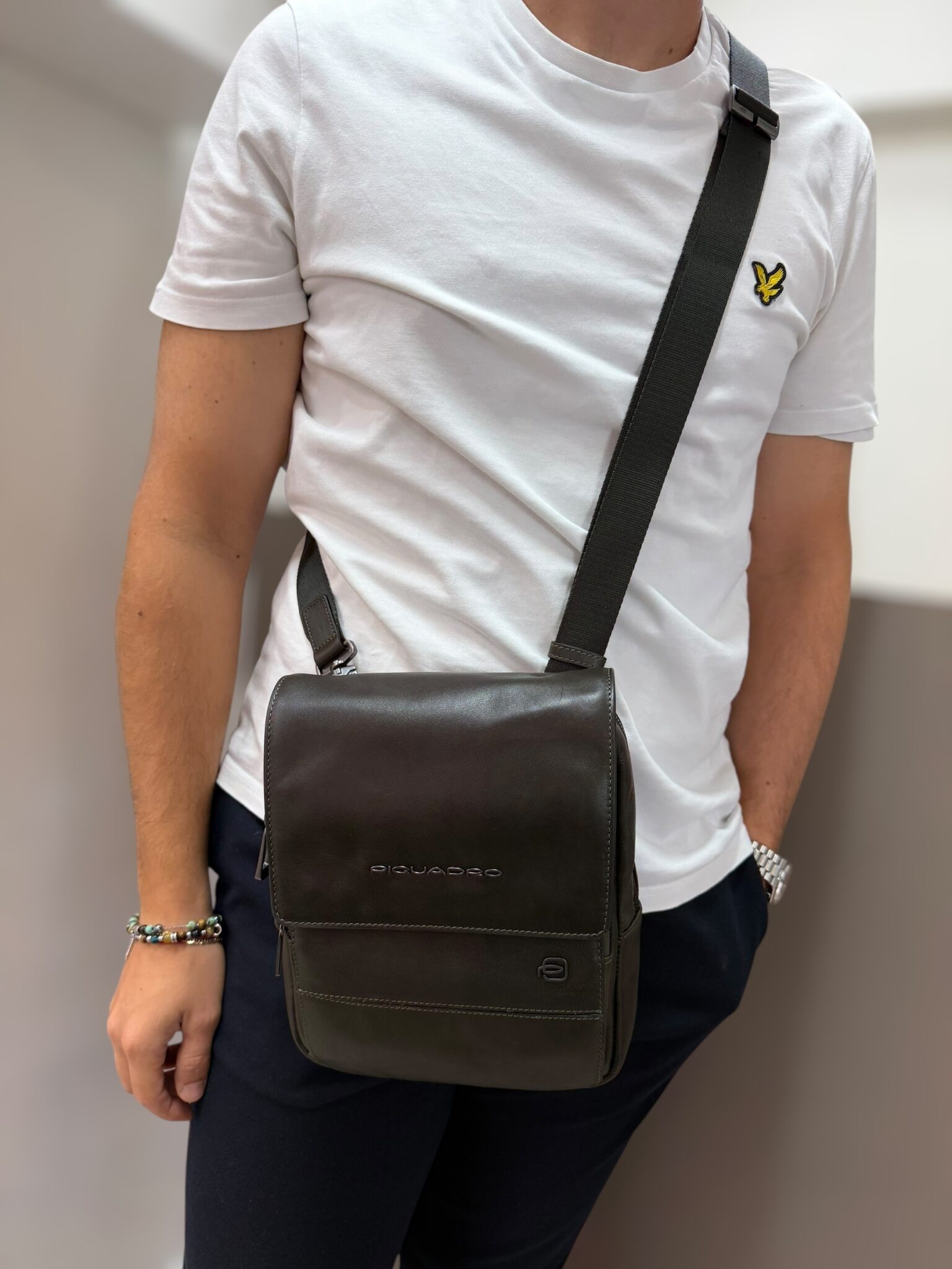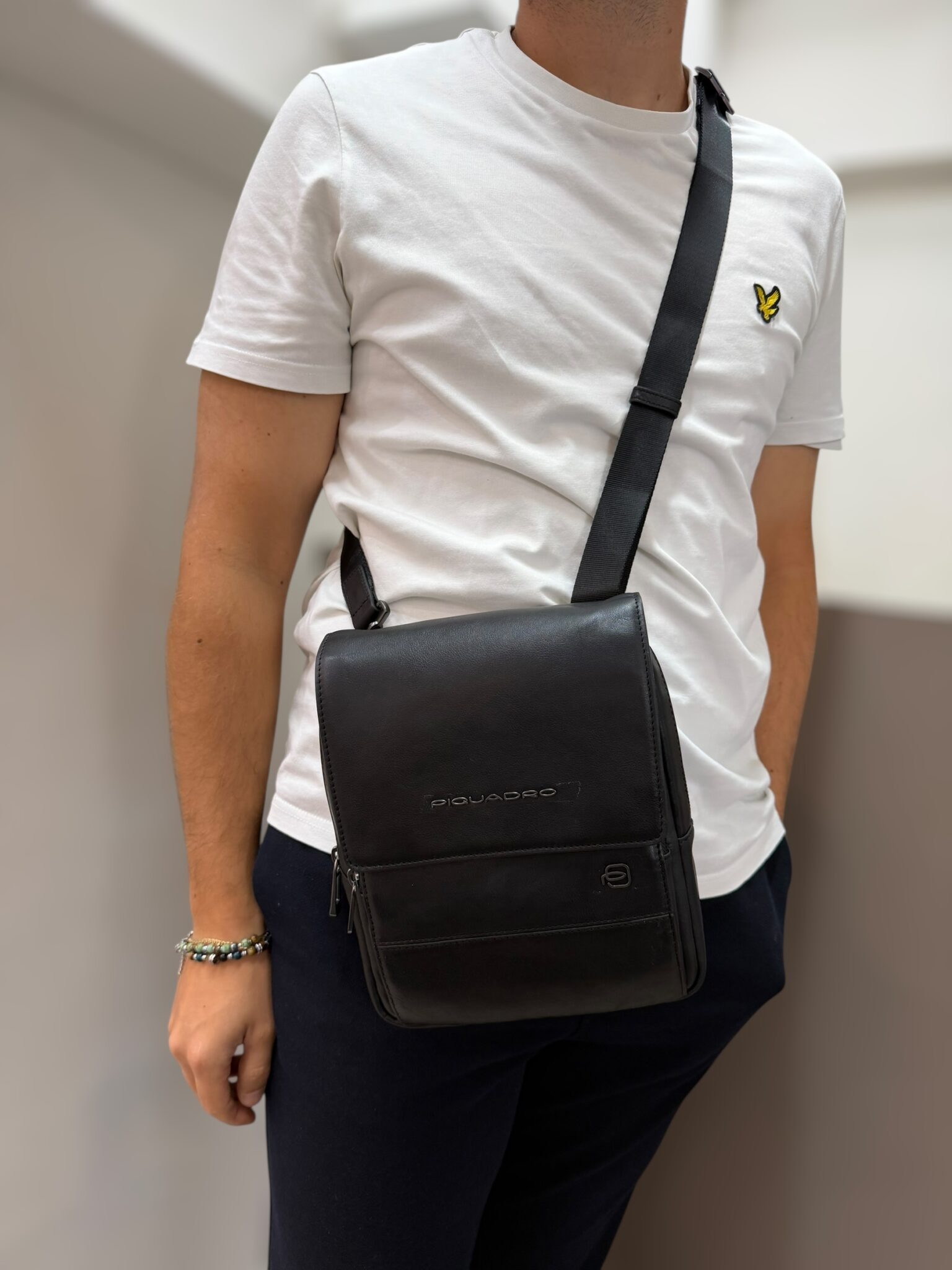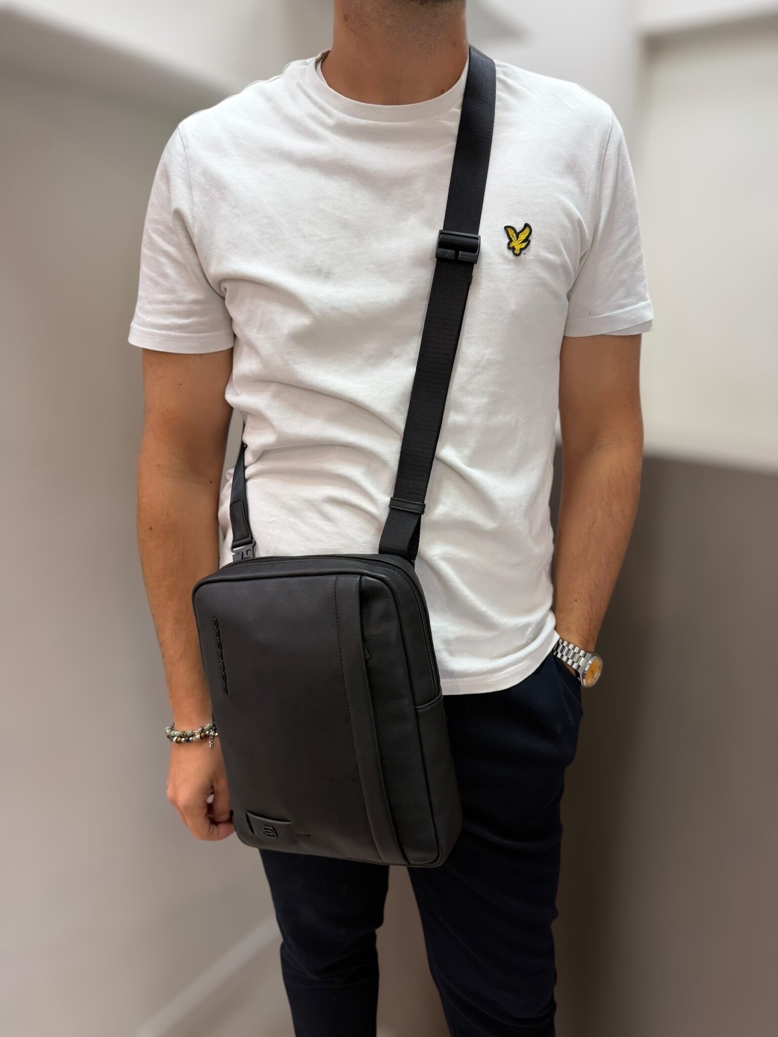 Tracolla uomo realizzata in morbida pelle martellata. Chiusura principale con zip. L’interno è foderato e dispone di inserti porta oggetti, tra cui l’inserto imbottito per tablet. Esternamente è dotata di 2 tasche con zip. Una frontale con apertura verticale e una posteriore con apertura orizzontale. Tracolla in tessuto regolabile.