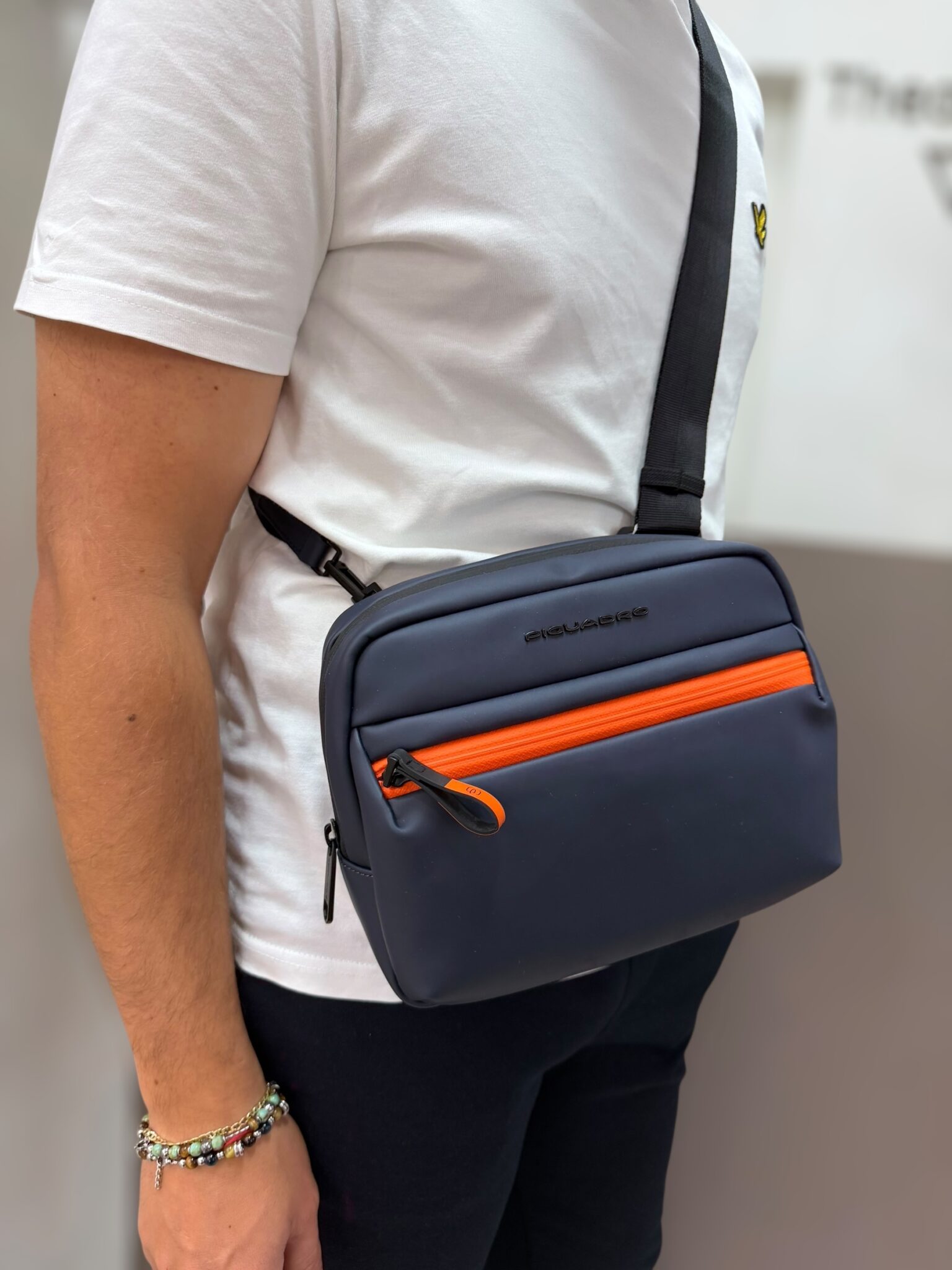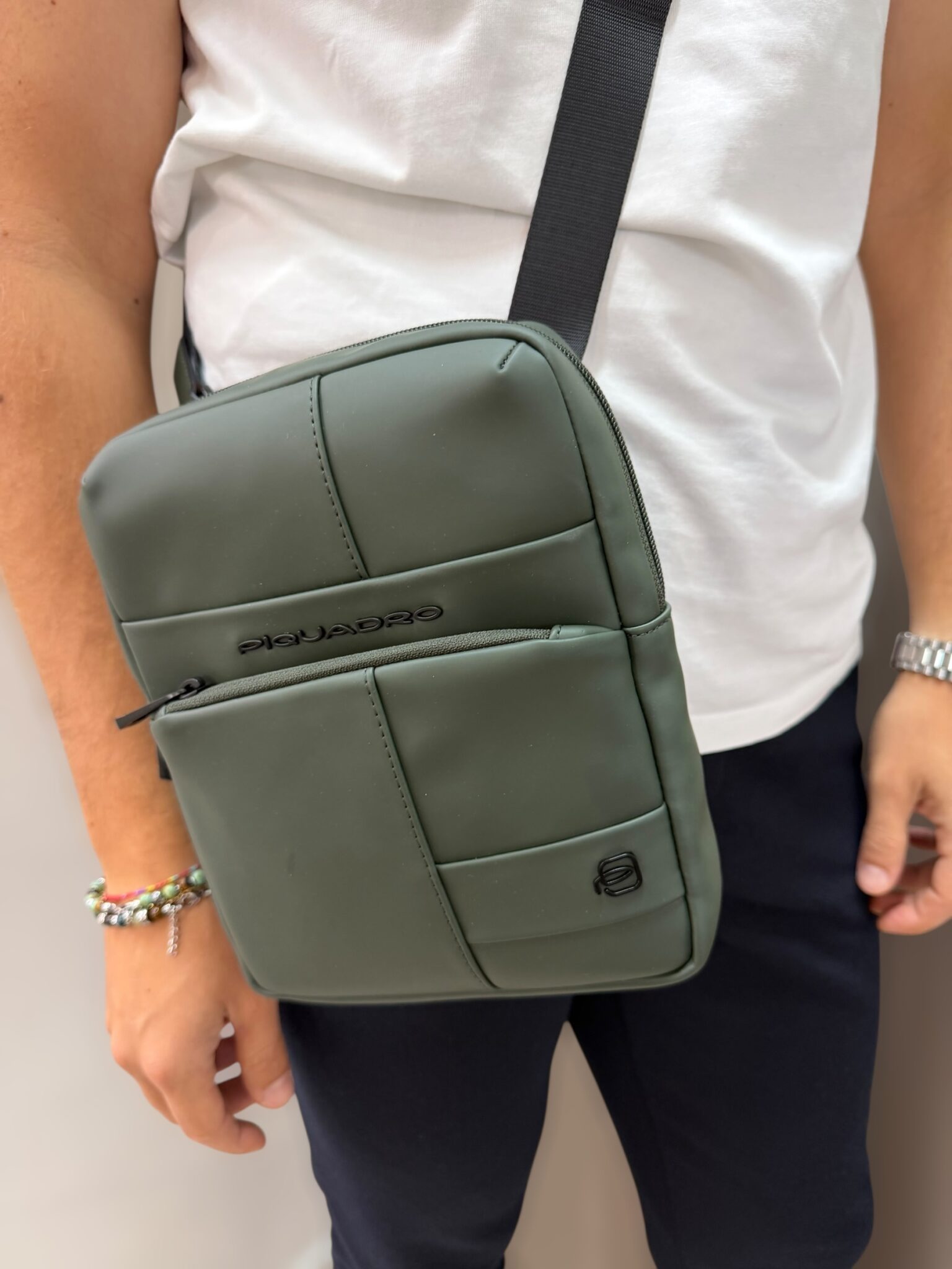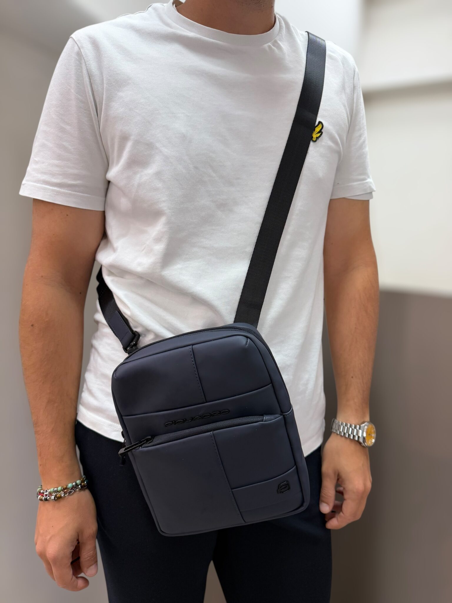 Tracolla uomo realizzata interamente in gomma impermeabile. Chiusura principale con zip. Interni foderati con inserto imbottito per tablet e ulteriori inserti porta oggetti. Esternamente è dotata di una tasca frontale e di una posteriore, entrambe chiuse con zip. Tracolla in tessuto regolabile con la possibilità di spostare uno dei due suoi moschettoni, per indossarla anche a monospalla.