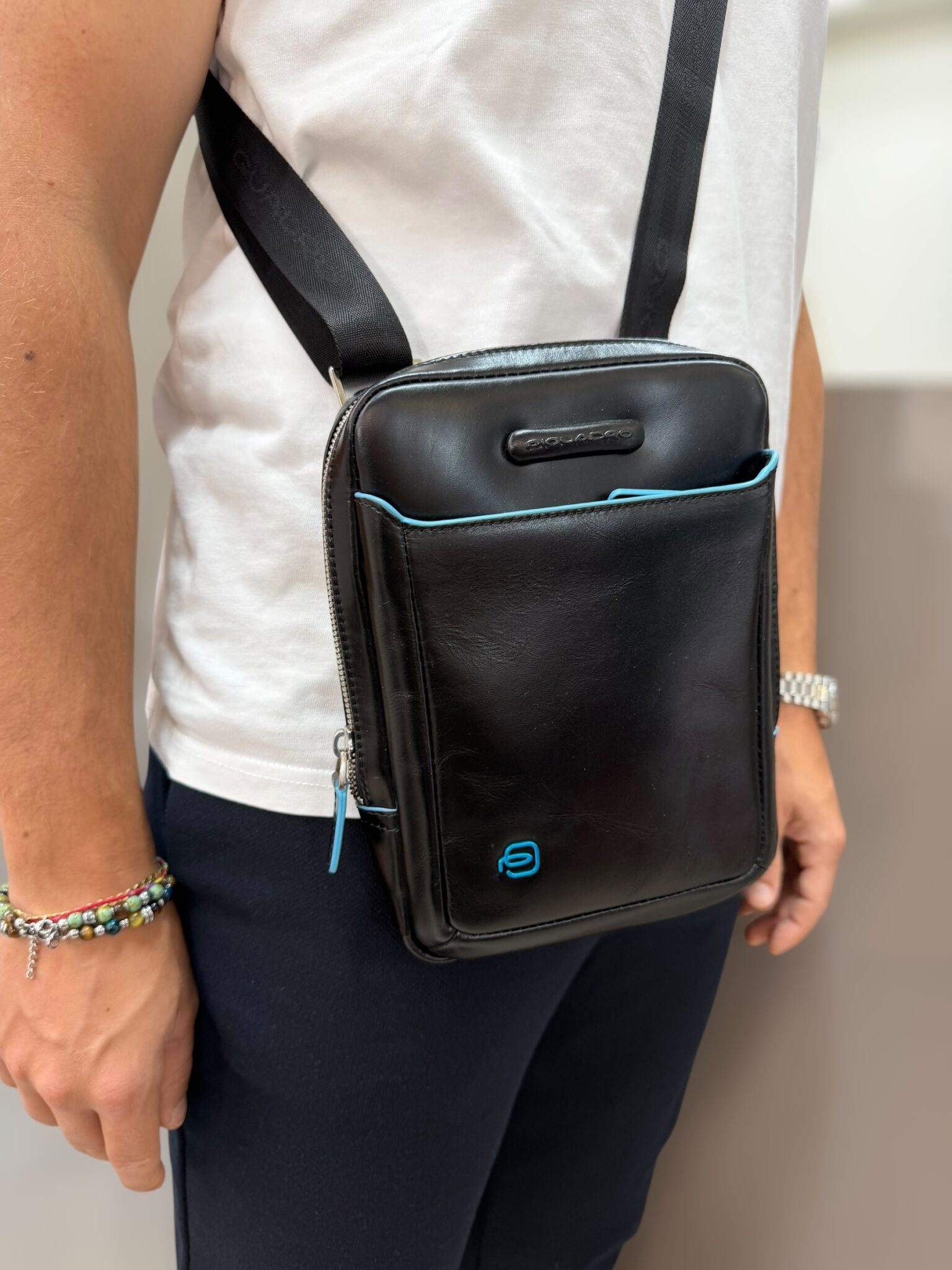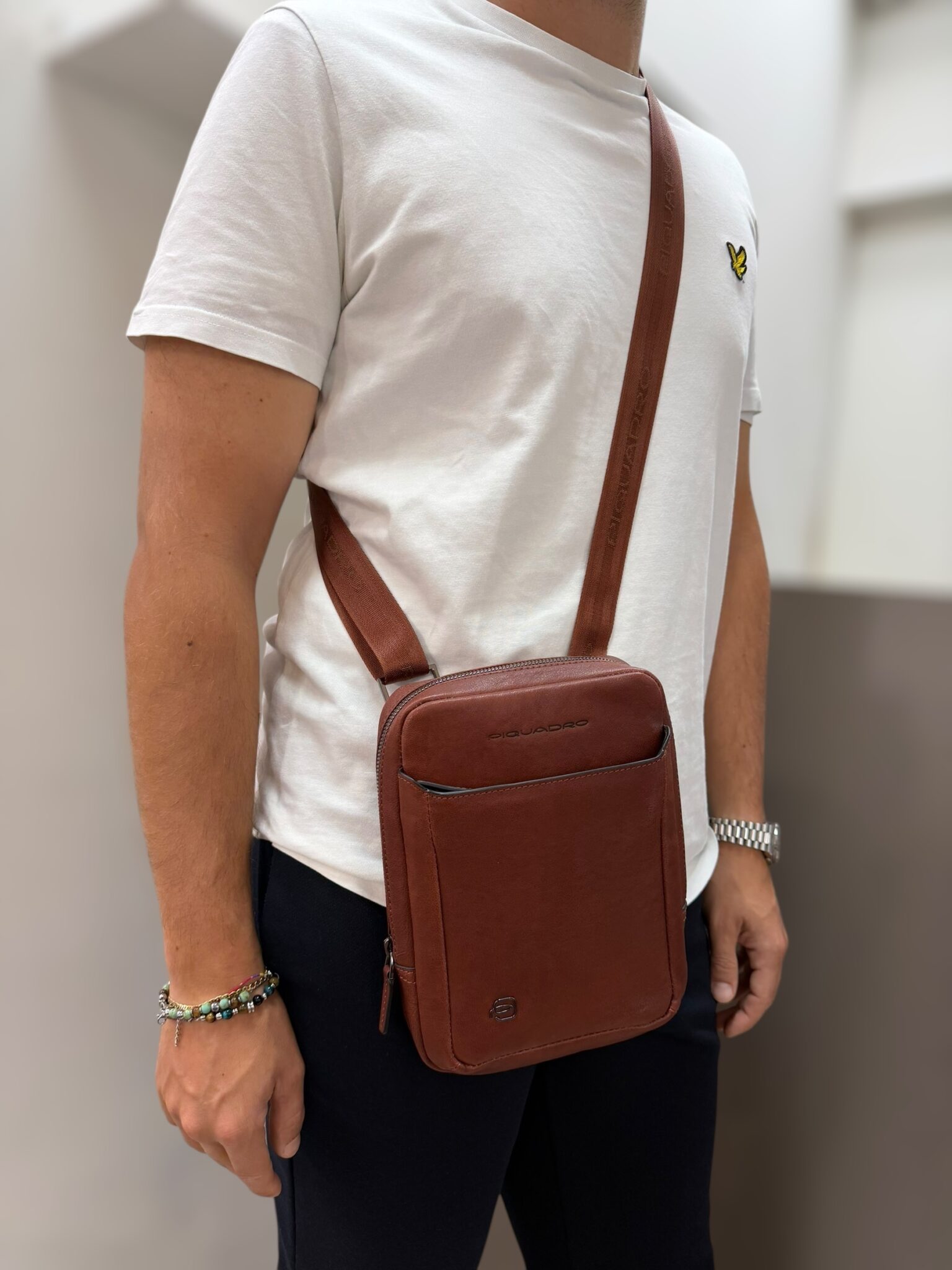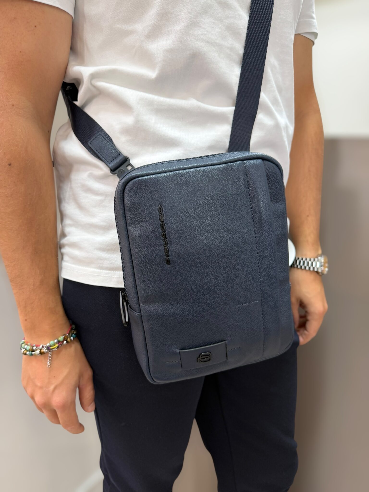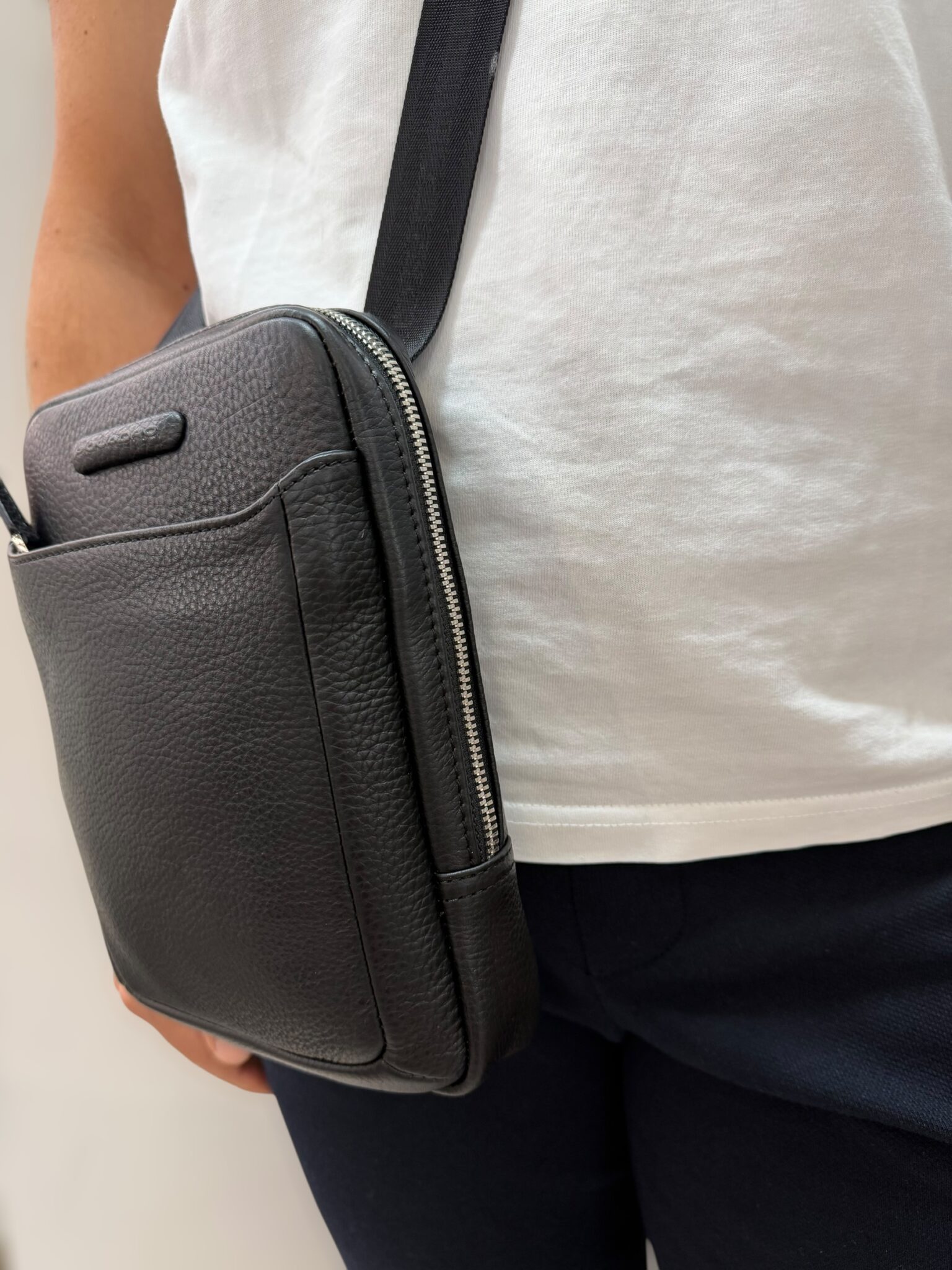 Tracolla uomo realizzata in morbida pelle martellata. Chiusura principale con zip. L’interno è foderato e dispone di inserti porta oggetti, tra cui l’inserto imbottito per tablet. Esternamente è dotata di 2 tasche con zip. Una frontale con apertura verticale e una posteriore con apertura orizzontale. Tracolla in tessuto regolabile.