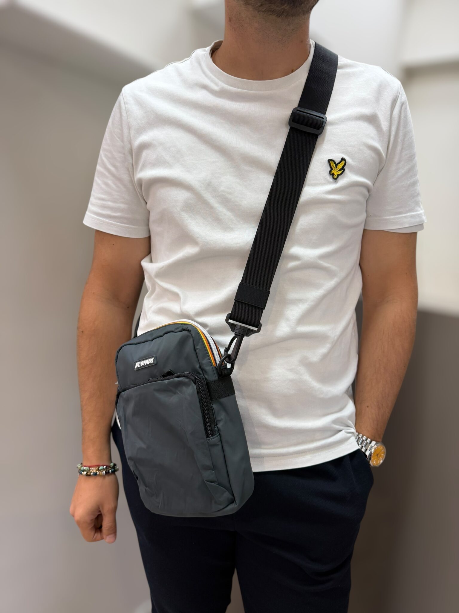 Tracolla uomo realizzata interamente in tessuto. Chiusura principale con zip. Interni foderati con inserto imbottito per tablet e ulteriori inserti porta oggetti. Esternamente è dotata di una tasca frontale e di una posteriore, entrambe chiuse con zip. Tracolla in tessuto regolabile con la possibilità di spostare uno dei due suoi moschettoni, per indossarla anche a monospalla.