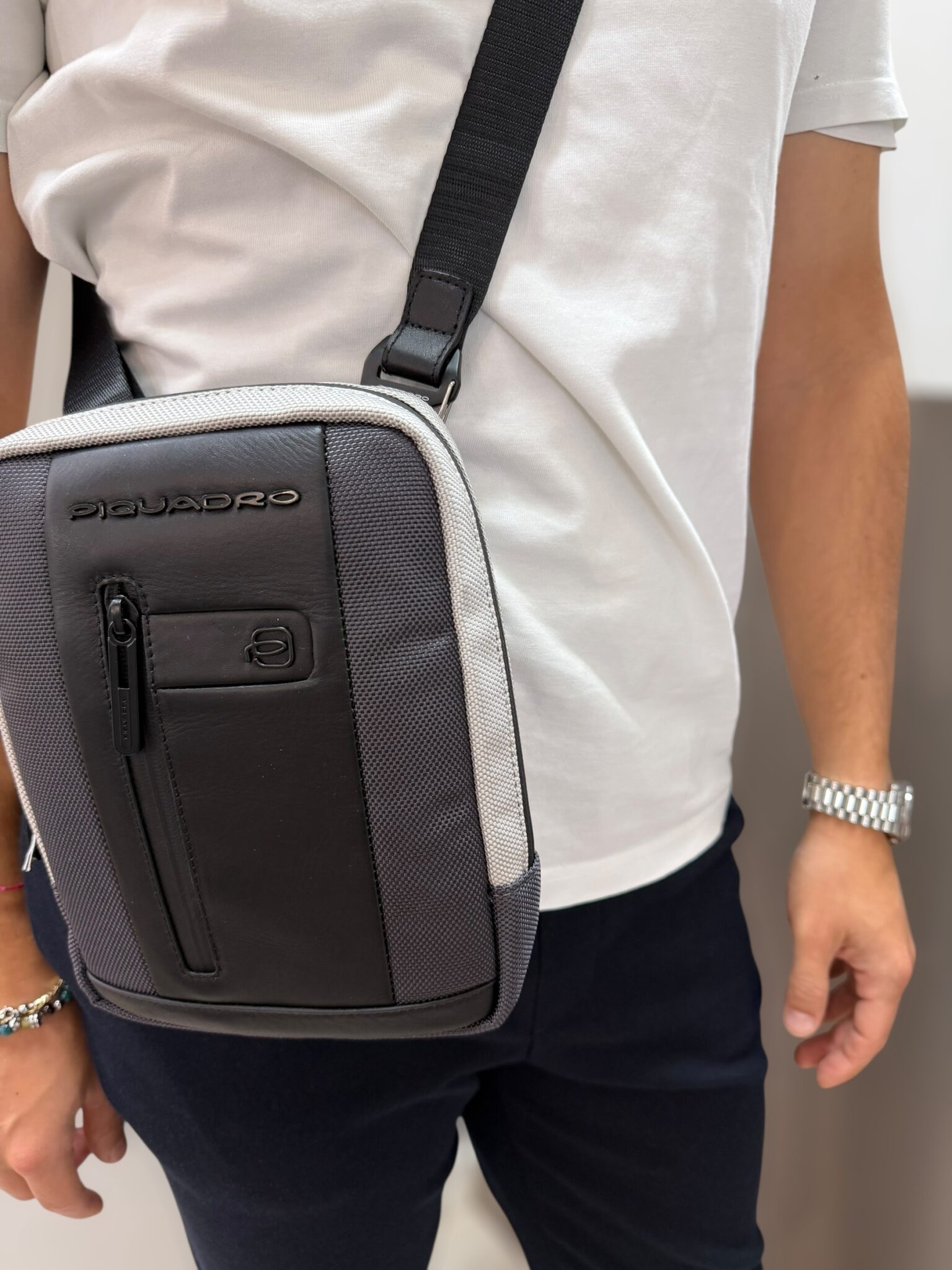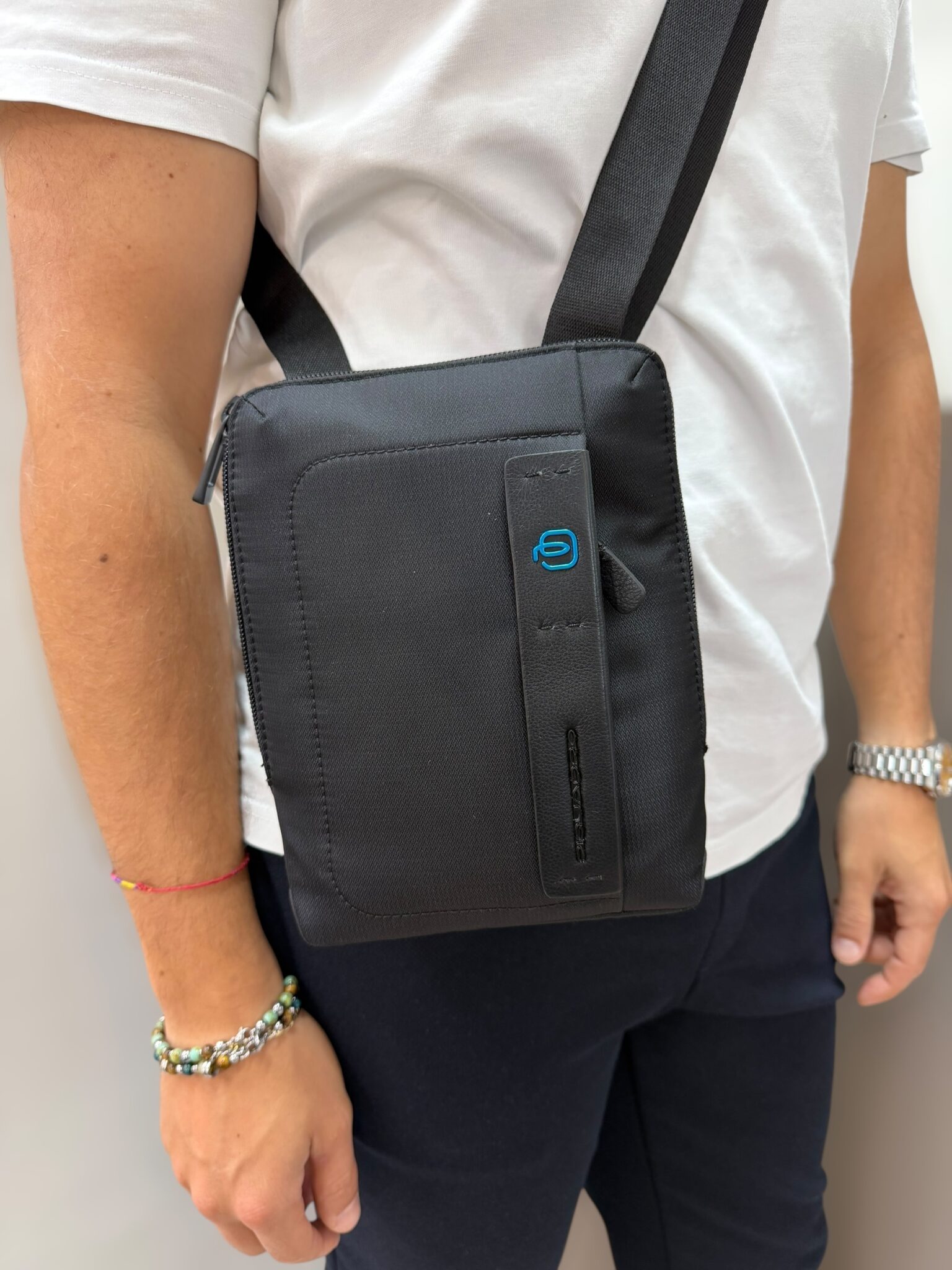 Tracolla uomo realizzata in tessuto impermeabile con rifiniture in pelle. Chiusura principale con zip. Interni foderati con inserto imbottito porta tablet e ulteriori inserti porta oggetti. Dotata di tracolla lunga regolabile in tessuto tramite fibbia.