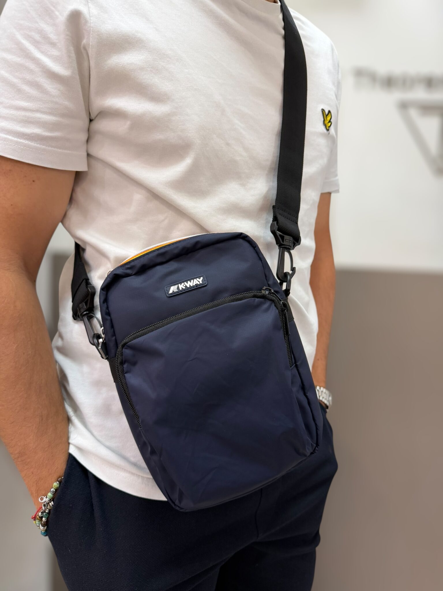 Tracolla uomo realizzata in tessuto impermeabile con rifiniture in pelle. Chiusura principale con zip. Interni foderati con inserto imbottito porta tablet e ulteriori inserti porta oggetti. Dotata di tracolla lunga regolabile in tessuto tramite fibbia.