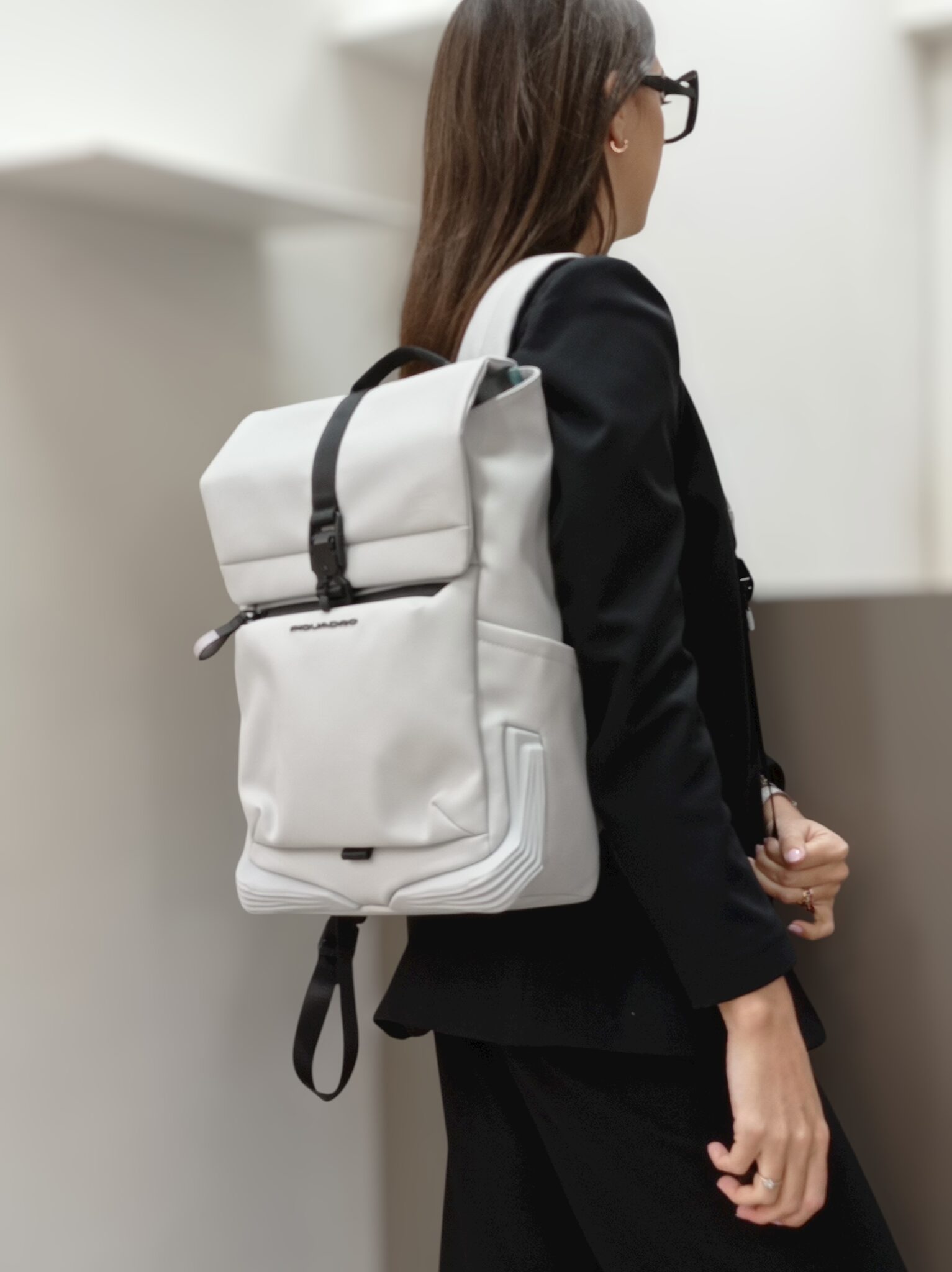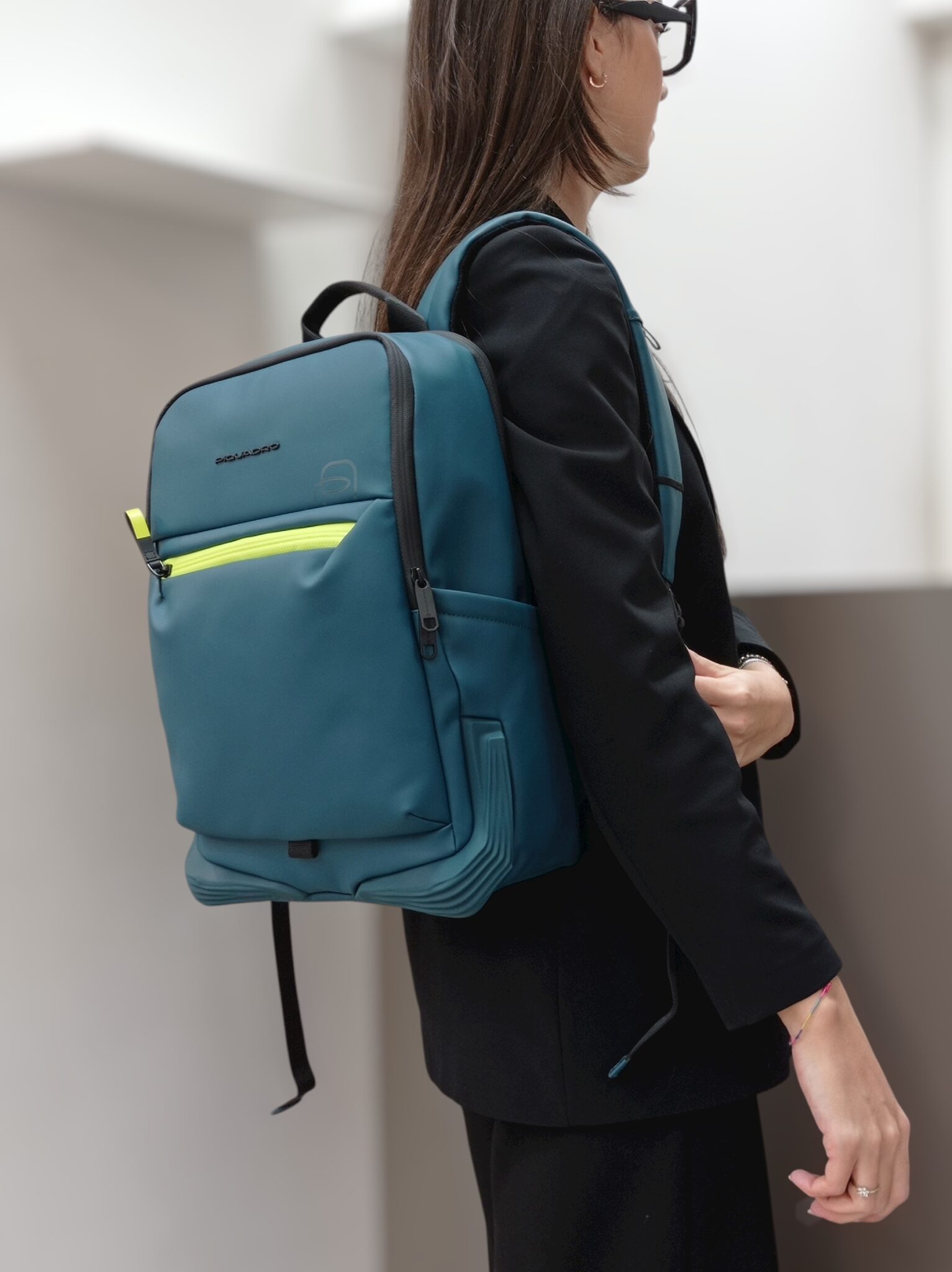 Zaino realizzato interamente in gomma impermeabile. Organizzato in due scomparti separati, entrambi con chiusura zip. Il primo scomparto é dedicato a due inserti imbottiti per tablet e computer. Il secondo scomparto, dotato di apertura totale, é dedicato al necessario per l’ufficio o per il viaggio. Esternamente é dotato di una tasca frontale con zip, di due tasche laterali porta bottiglia e porta ombrello, della tassia nascosta con protezione RFID e l’aggancio per il trolley nella parte posteriore. Completano lo zaino due spallacci imbottiti, regolabili e rifiniti in gomma e un manico superiore.