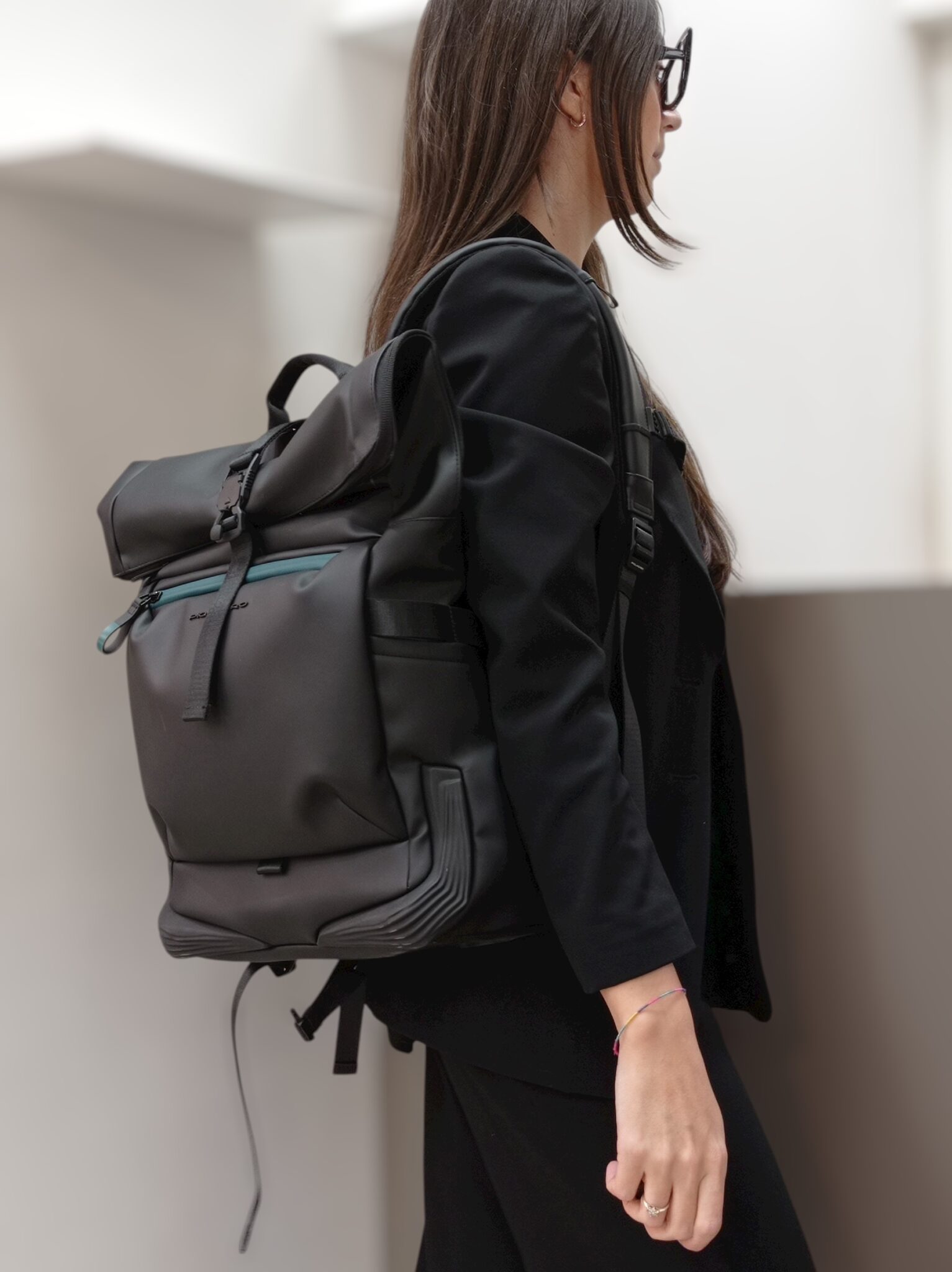 Zaino realizzato interamente in gomma impermeabile. Organizzato in due scomparti separati, entrambi con chiusura zip. Il primo scomparto é dedicato a due inserti imbottiti per tablet e computer. Il secondo scomparto, dotato di apertura totale, é dedicato al necessario per l’ufficio o per il viaggio. Esternamente é dotato di una tasca frontale con zip, di due tasche laterali porta bottiglia e porta ombrello, della tassia nascosta con protezione RFID e l’aggancio per il trolley nella parte posteriore. Completano lo zaino due spallacci imbottiti, regolabili e rifiniti in gomma e un manico superiore.