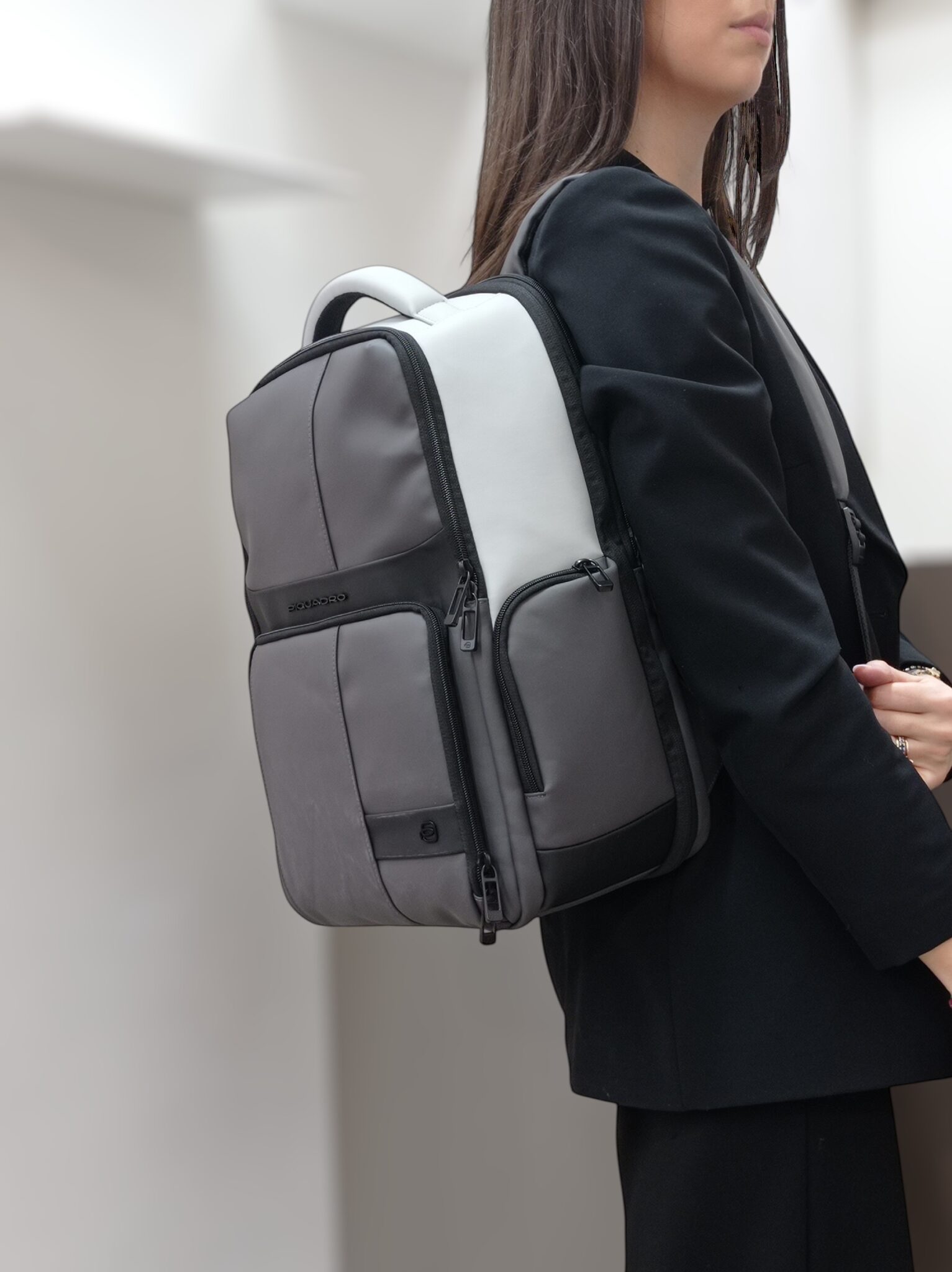 Zaino realizzato interamente in gomma impermeabile, organizzato in due scomparti separati, entrambi con chiusura zip. Gli interni sono foderati e dotati di molteplici inserti porta oggetti, compresi gli inserti imbottiti per tablet e computer. Nella parte esterna troviamo invece una tasca frontale con zip a contrasto, due tasche laterali porta bottiglia e porta ombrello; nella parte posteriore, troviamo aggancio per il trolley e tasca nascosta con zip con protezione RFID per poter riporre portafogli e oggetti di valore. Completano due spallacci imbottiti e regolabili, rifiniti in gomma. Fodera interna colorata.