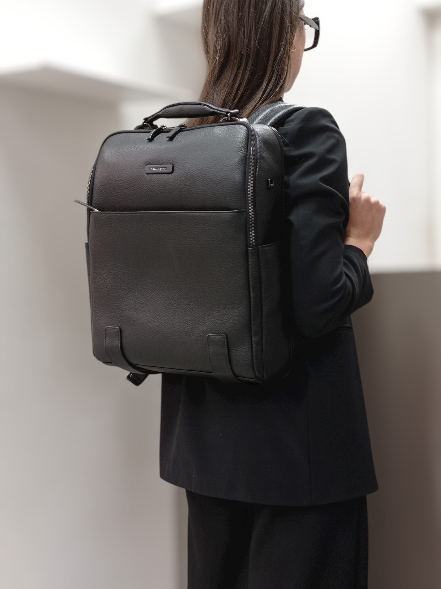 Zaino realizzato in tessuto riciclato impermeabile. Organizzato in due scomparti separati, entrambi con chiusura zip. Gli interni sono foderati e dotati di molteplici inserti interni porta oggetti, compresi gli inserti imbottiti per tablet e computer. Esternamente è dotato di due tasche frontali con apertura zip e di una tasca laterale in tessuto estraibile e termica per bottiglia. Nella parte posteriore troviamo uno schienale imbottito con aggancio per trolley insieme alla tasca nascosta con protezione RFID con chiusura zip. Spallacci imbottiti e regolabili. Completa lo zaino una comoda estensione di 5 cm donandoci, oltre al maggiore volume, anche un ulteriore ampio scomparto con ulteriore zip dotato dei nastri per tenere fermi gli indumenti.