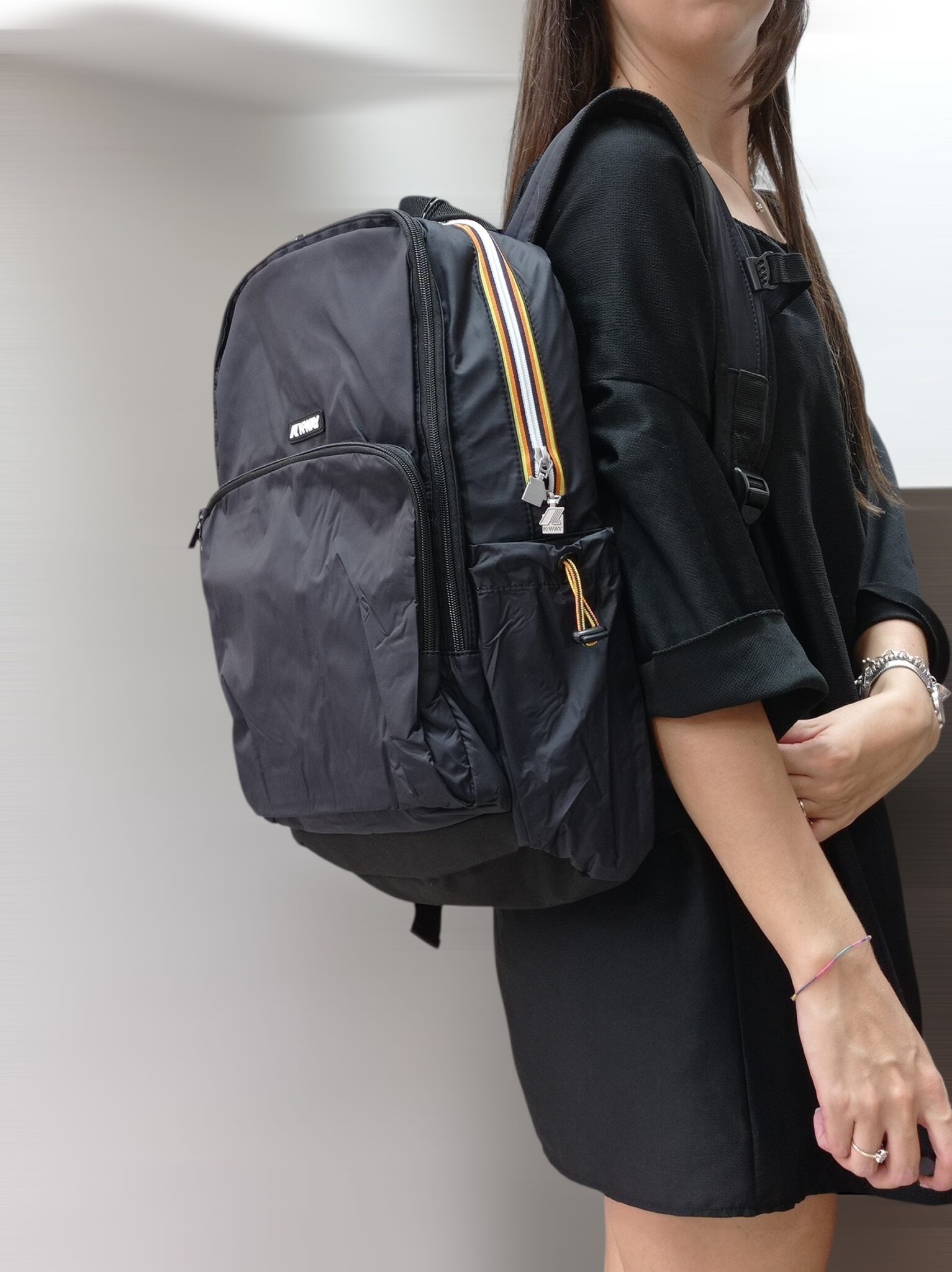 Zaino realizzato in leggero nylon impermeabile organizzato in doppio scomparto con  zip a contrasto. Interno foderato con molteplici inserti porta oggetti. Dotato di una comoda tasca esterna nella parte frontale e delle due tasche laterali porta bottiglia e porta ombrello. Inoltre è dotato di due spallacci imbottiti e regolabili.