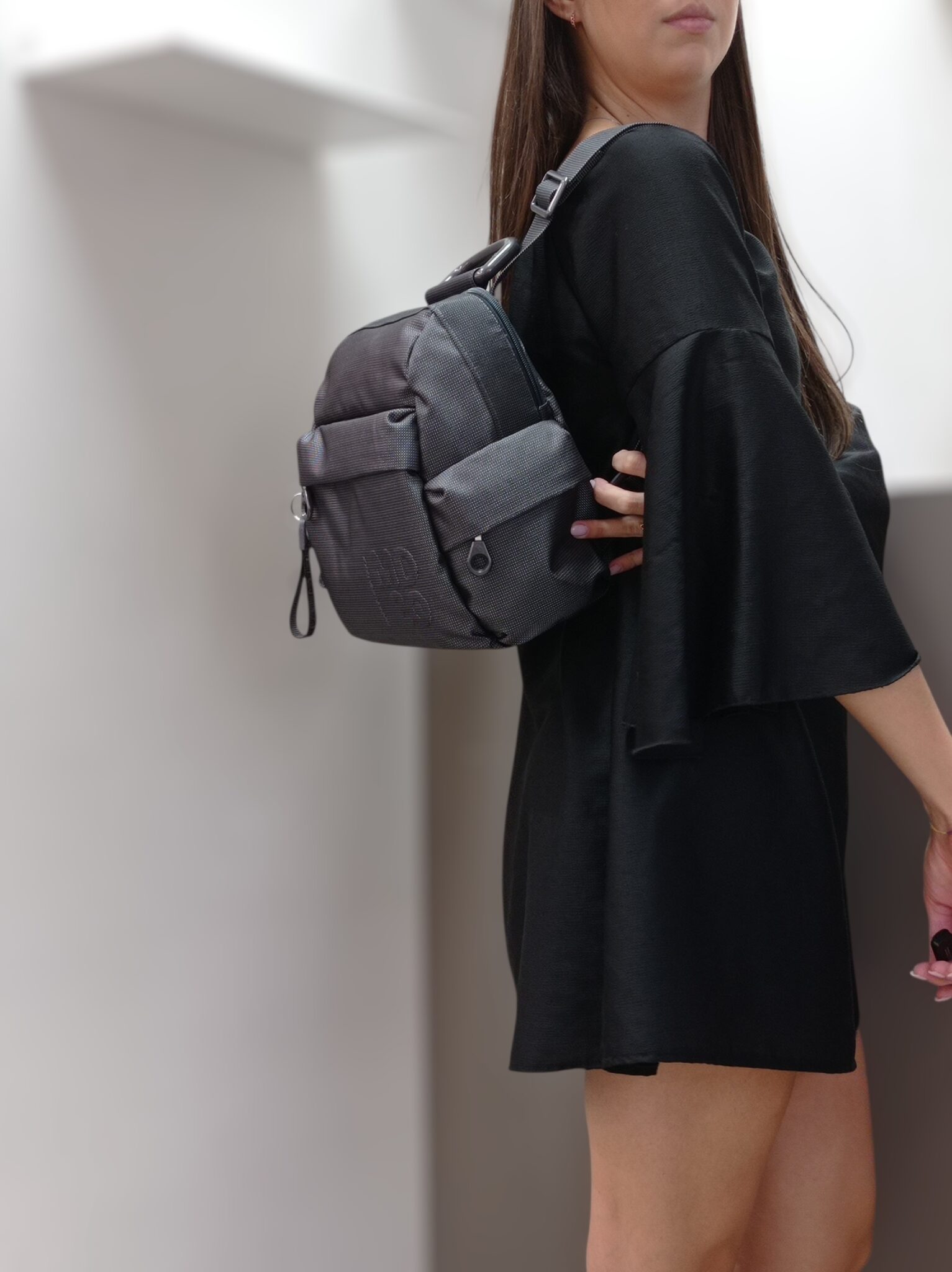 Zaino realizzato in morbida pelle martellata. Chiusura principale con zip; l’interno è foderato con 2 taschine aperte e 1 chiusa con zip. Esternamente è dotato di tre tasche frontali, due aperte e una con chiusura verticale tramite zip. Le bretelline sono in pelle, in tono e regolabili.