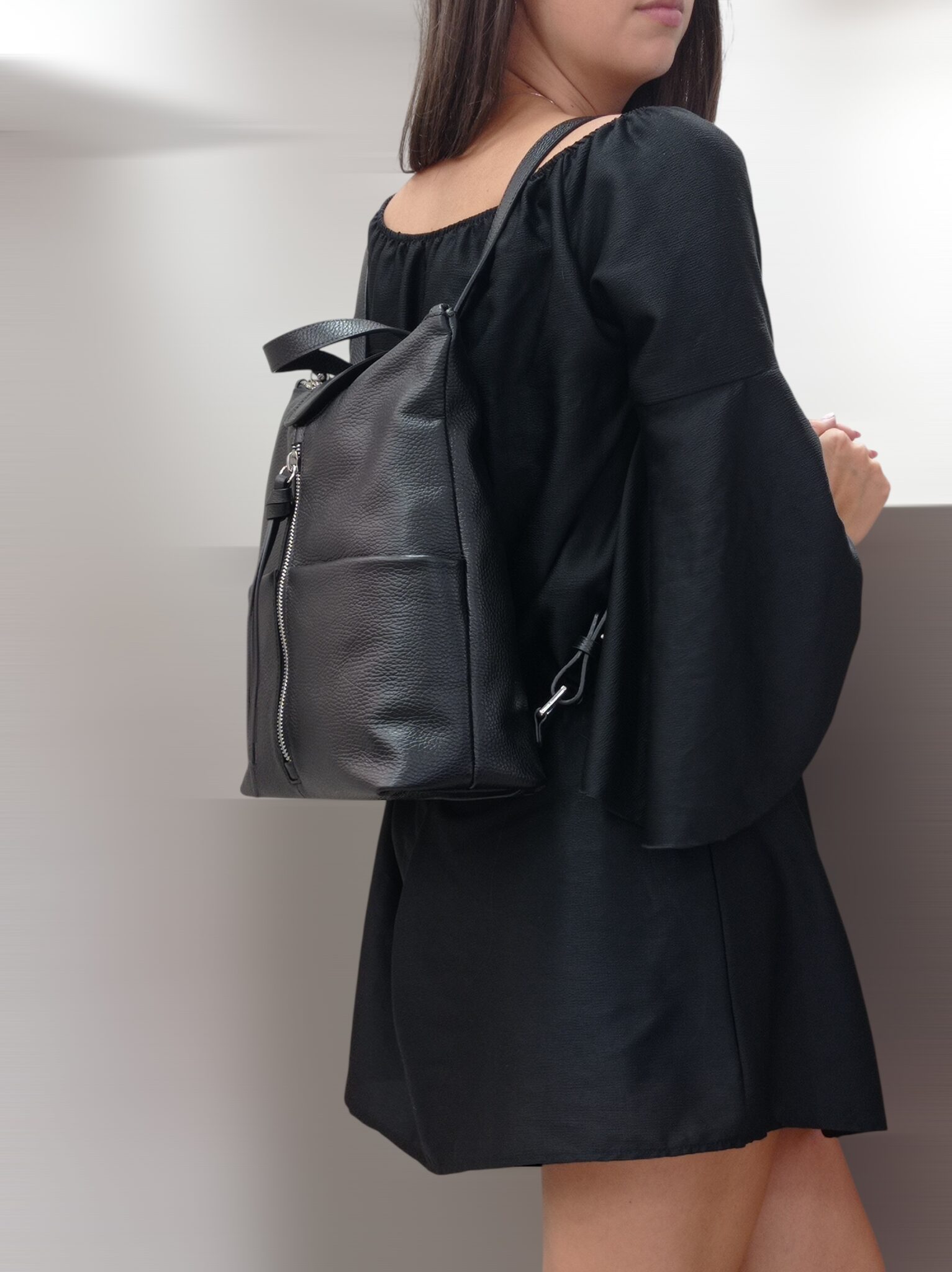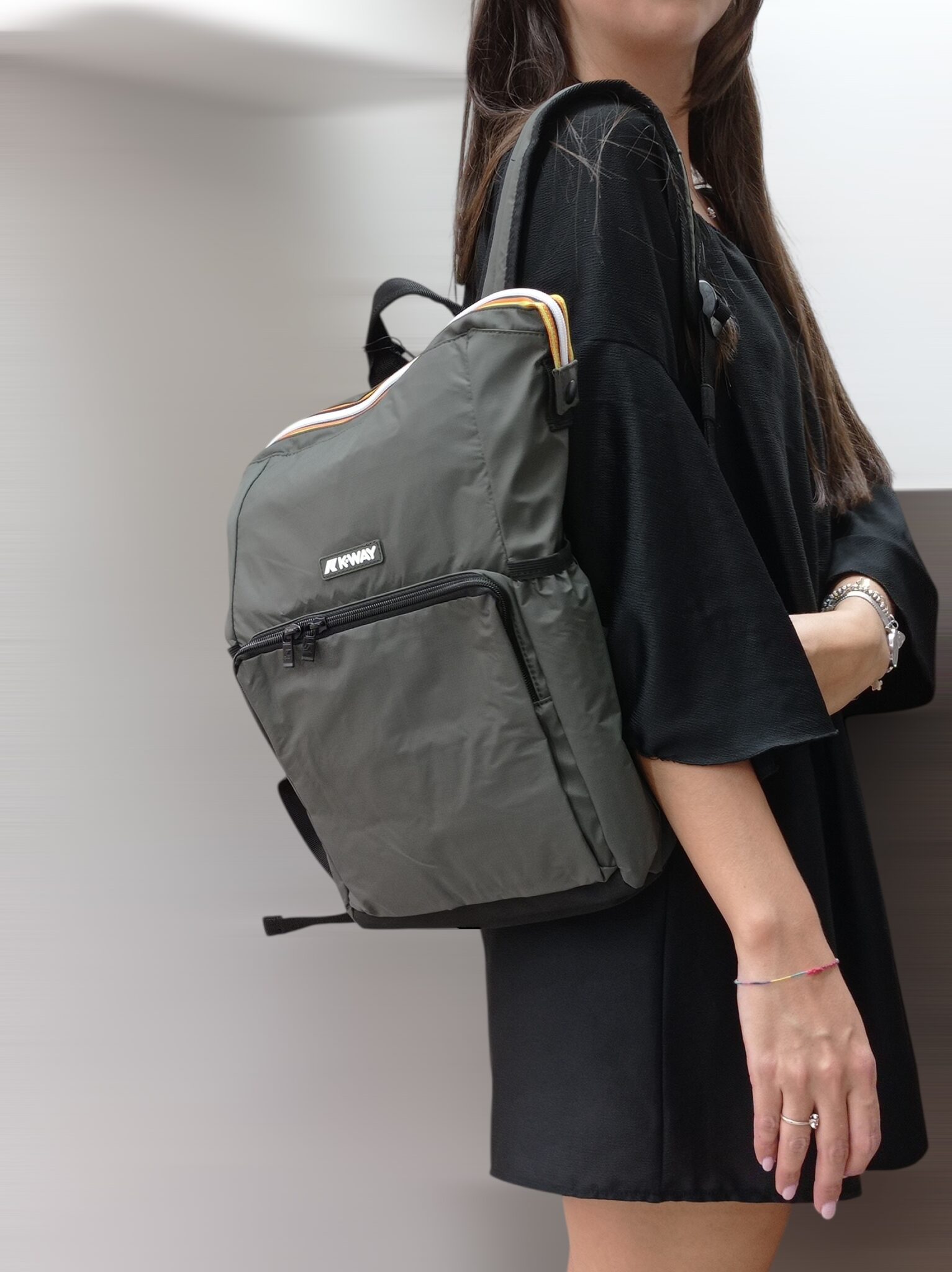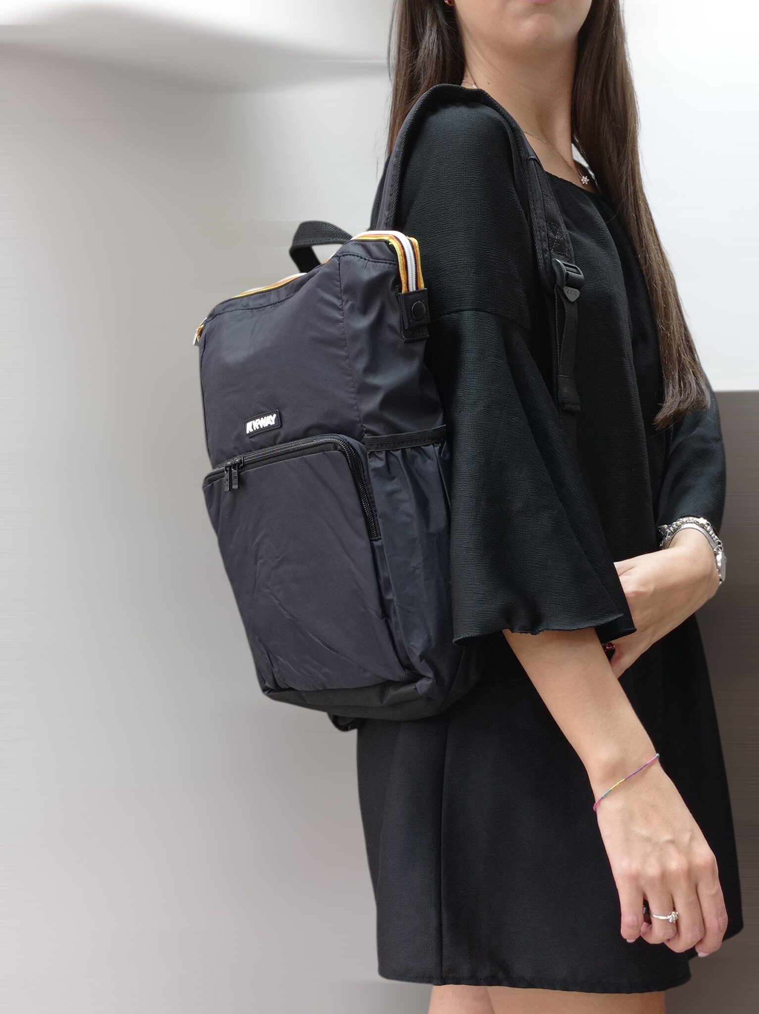 Zaino realizzato in leggero nylon impermeabile con  zip a contrasto. Interno foderato con molteplici inserti porta oggetti. Dotato di una comoda tasca esterna nella parte frontale e delle due tasche laterali porta bottiglia e porta ombrello. Inoltre è dotato di due spallacci imbottiti e regolabili.