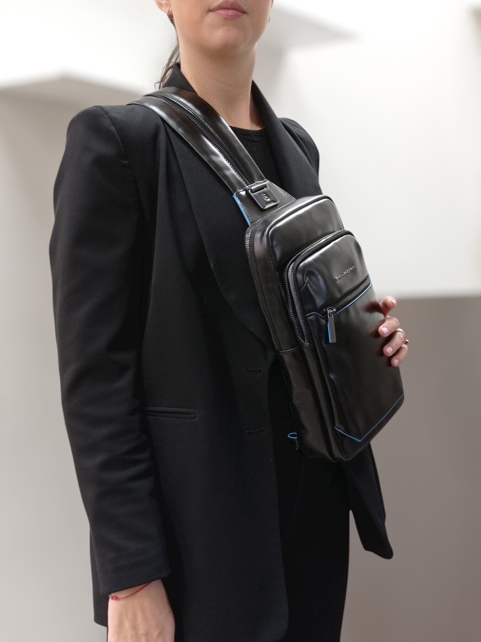 Zaino monospalla realizzato interamente in gomma. Organizzato in un unico scomparto con interno foderato e con inserti porta oggetti. Esternamente è dotato della tasca posteriore di sicurezza con protezione RFID e di una tasca con chiusura zip nella parte frontale. Le bretelle sono imbottite, regolabili e dotate di una zip per poterle dividere, così da poter indossare il monospalla anche a zaino.