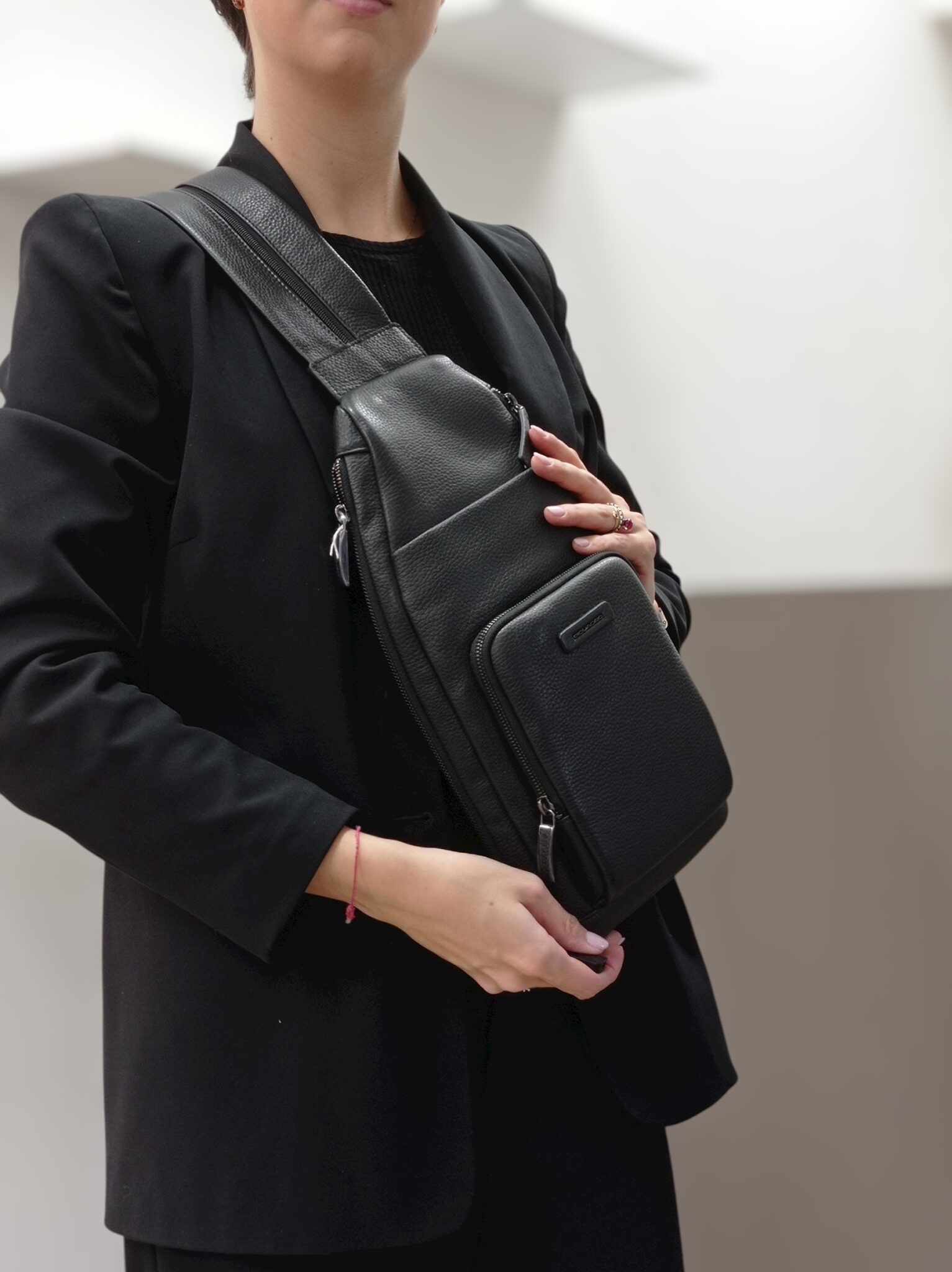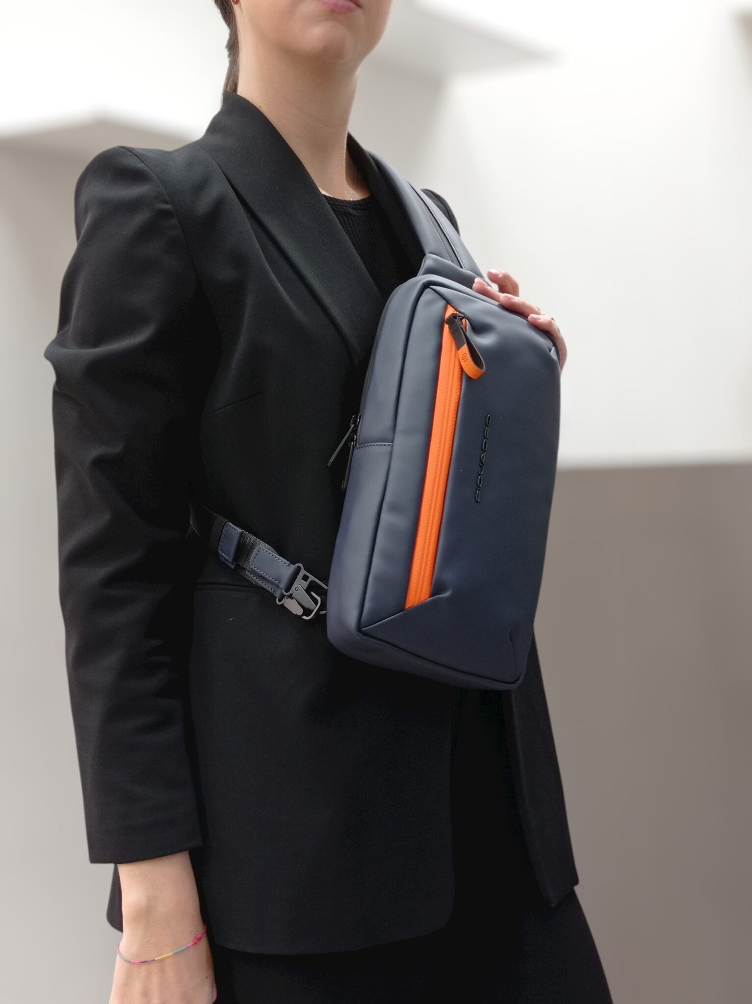 Zaino monospalla realizzato interamente in tessuto tecnico. Organizzato in un unico scomparto con interni foderati e dotati di inserti porta oggetti e porta tablet. Esternamente è dotato della tasca posteriore di sicurezza con protezione RFID, di una tasca frontale con apertura verticale tramite zip e della tasca laterale termica per bottiglia. Le bretelle sono imbottite e regolabili e dotate di zip centrale, avendo così la possibilità di ottenere due spallacci per indossare il monospalla anche a zaino. Complet lo zaino una comoda estensione di 5 cm per aumentare la sua capienza.