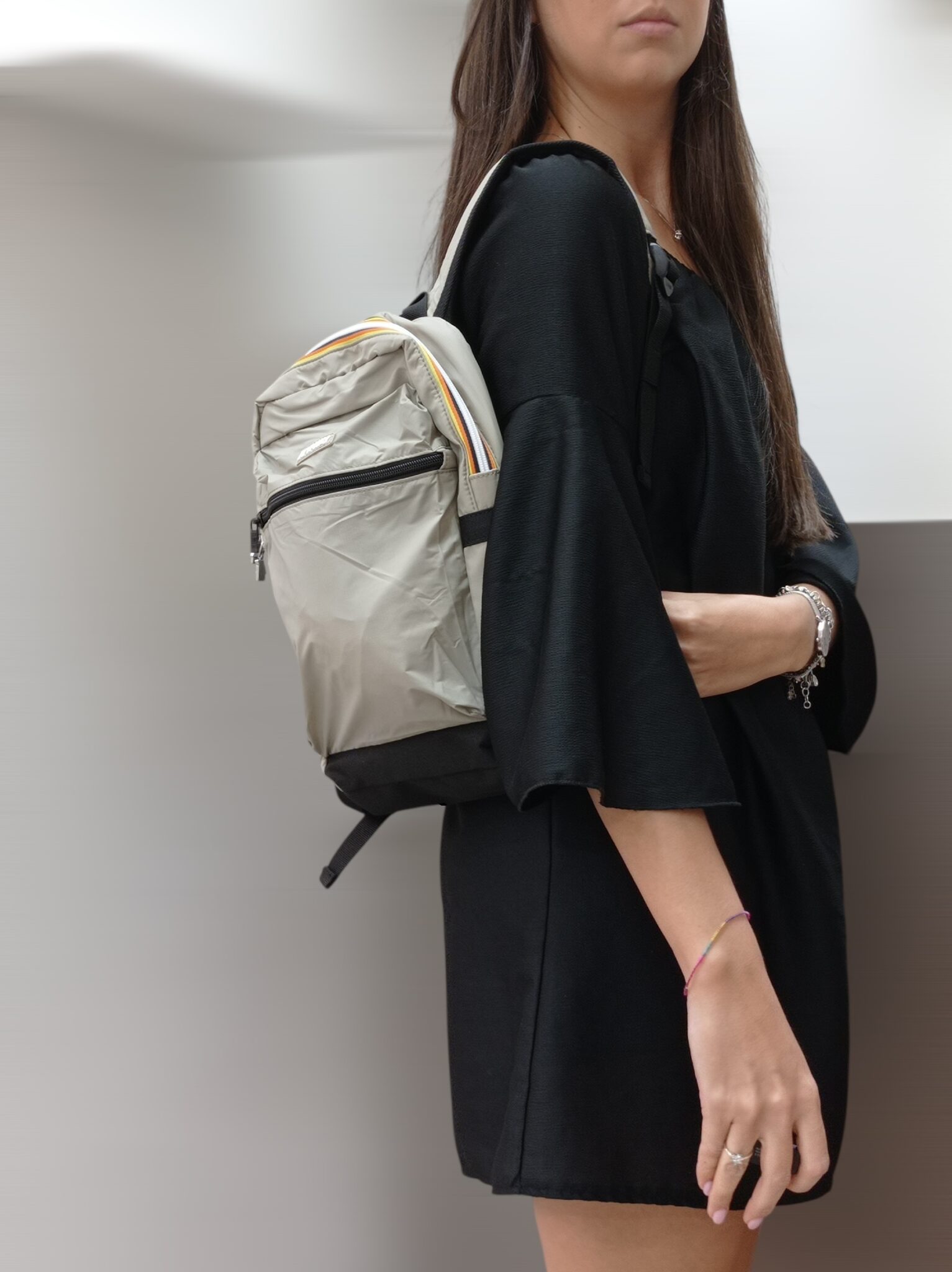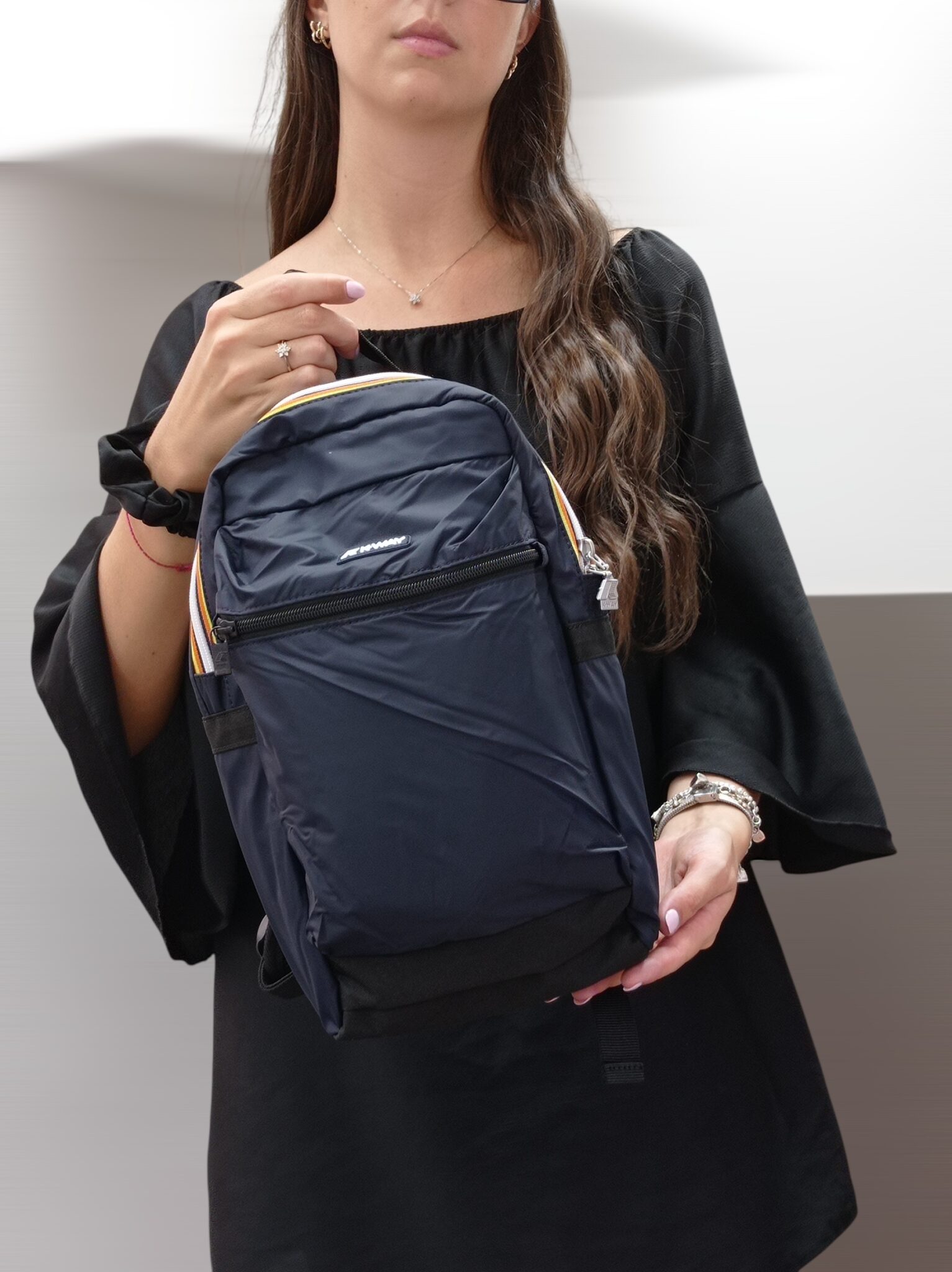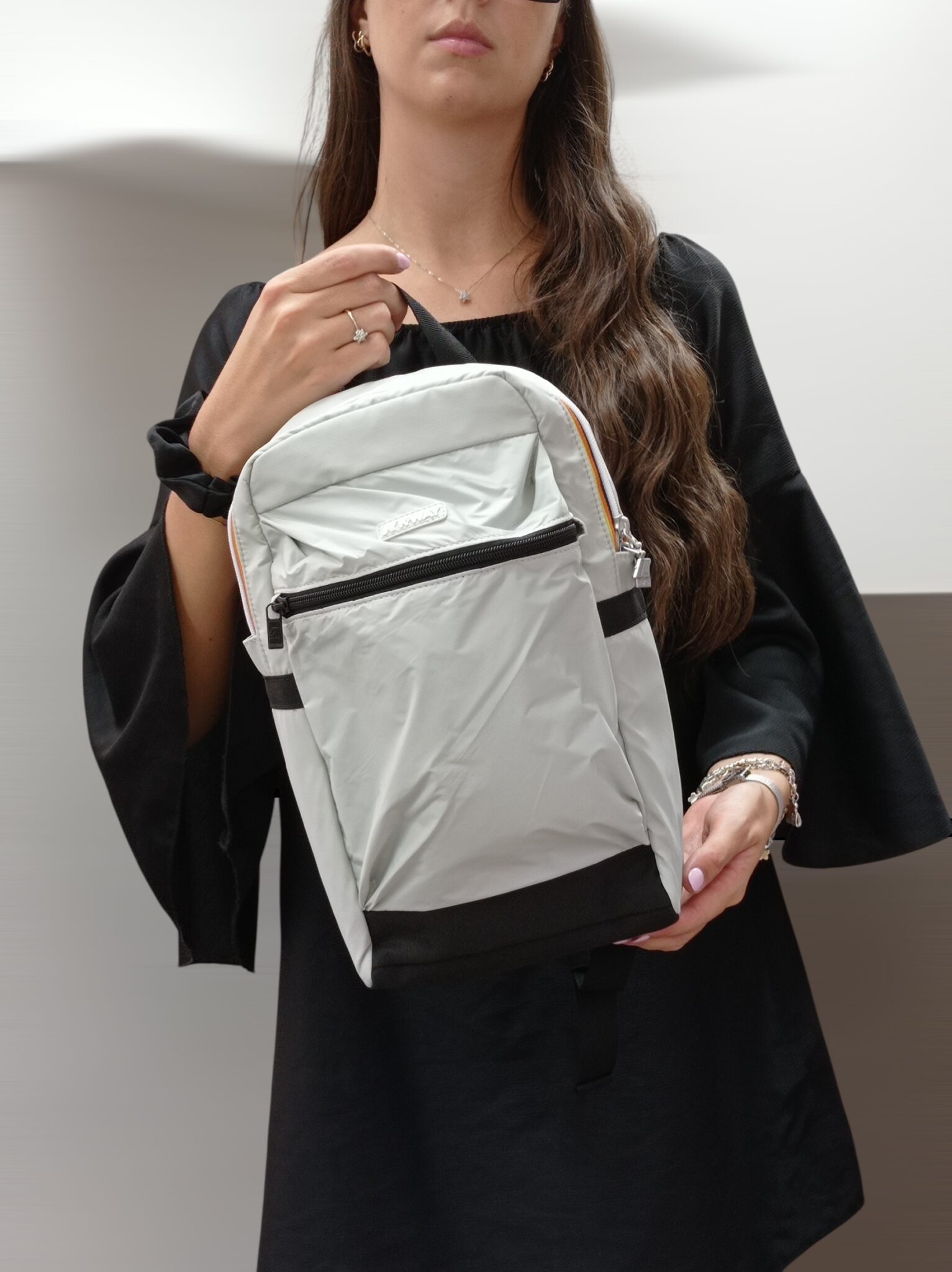 Zaino realizzato in leggero nylon impermeabile con  zip a contrasto. Interno foderato con molteplici inserti porta oggetti. Dotato di una comoda tasca esterna nella parte frontale e di due spallacci imbottiti e regolabili. Schienale imbottito.